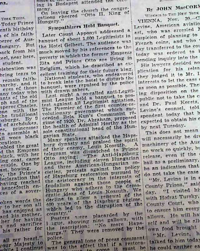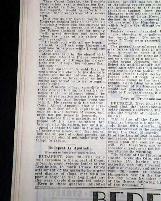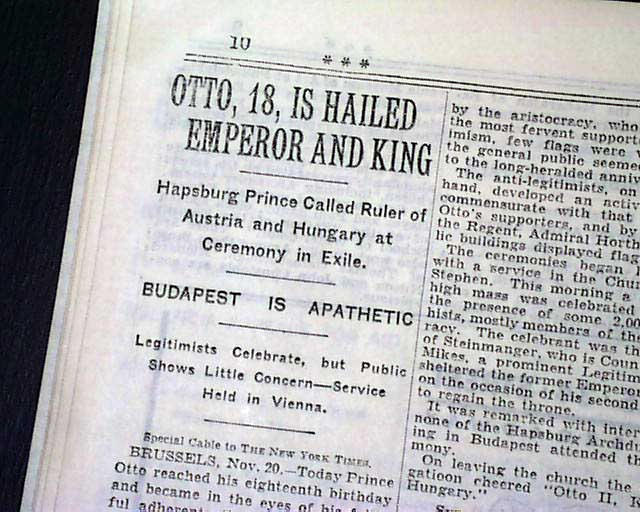 The top of page 10 has a one column heading: "OTTO, 18, IS HAILED EMPEROR AND KING" with subheads. (see) First report coverage on Otto von Habsburg becoming the last Emperor of Austria and King of Hungary. Always nice to have notable events in history reported in this world-famous publication.