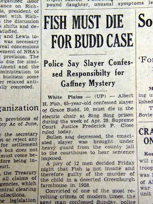 Page 3 has a one column heading: "FISH MUST DIE FOR BUDD CASE" with subhead. (see images)