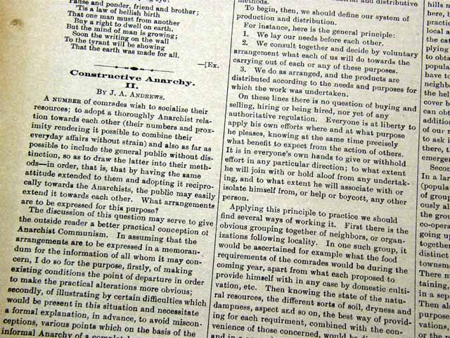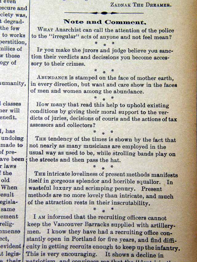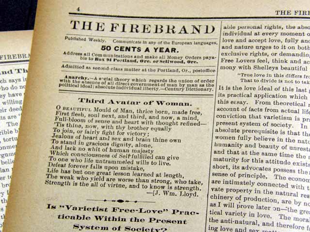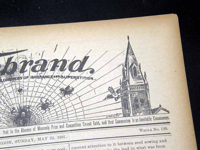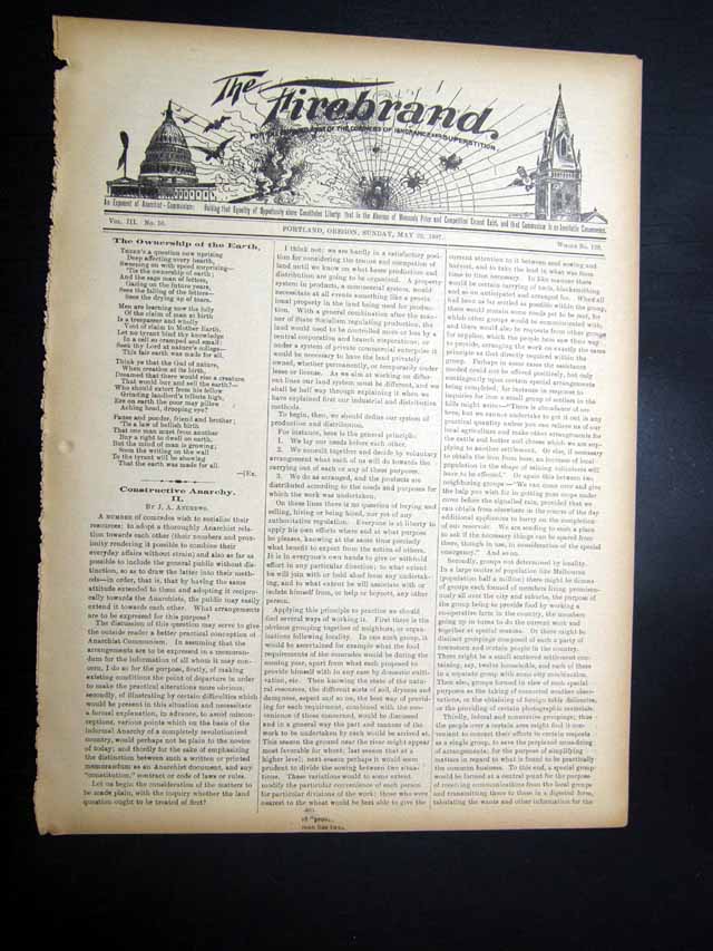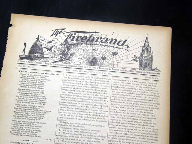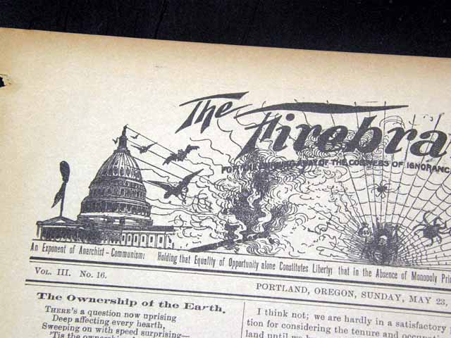 THE FIREBRAND, Portland, Oregon, May 23, 1897 A fascinating newspaper with their motto just under the title: "For the Burning Away of the Cobwebs of Ignorance and Superstition." and the dateline notes: "An Exponent of Anarchist - Communism. Holding that Equality of Opportunity alone Constitutes Liberty; that in the Absence of Monopoly Price and Competition Cannot Exist, and that Communism is an Inevitable Consequence."