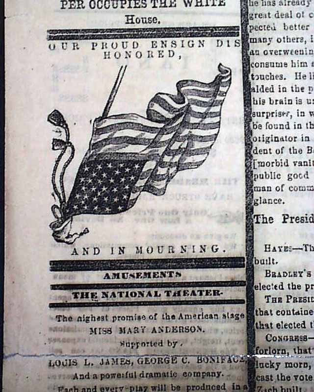 The first column has: "A FUNERAL PALL Hangs Over the Republic While A Fraudulent Usurper Occupies The White House" followed by an engraving of an upside-down U.S. Flag, headed: "Our Proud Ensign Dishonored, And In Mourning." Additionally all columns on all 4 pages have wide, back mourning rules.