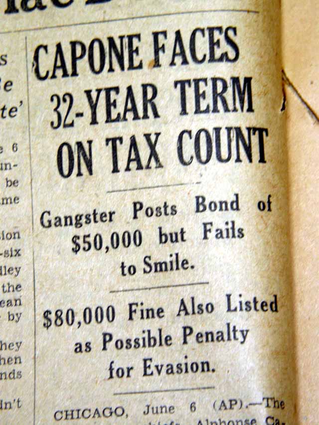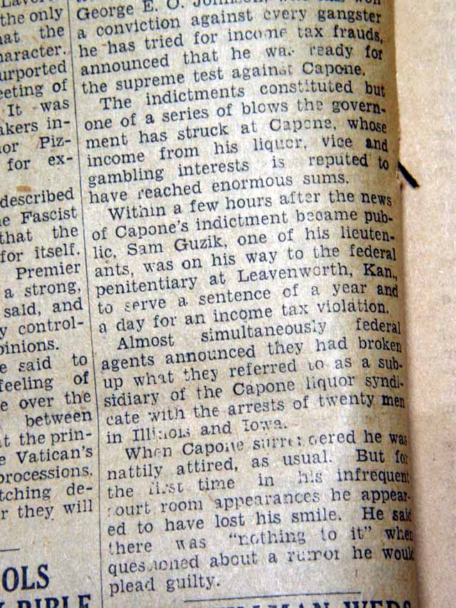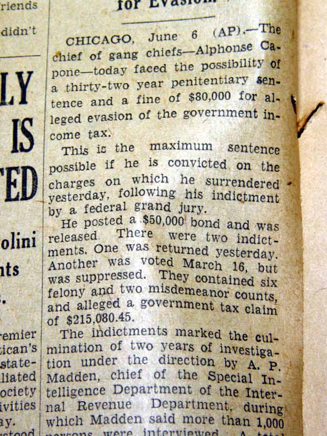 Page 2 has a one column heading: "CAPONE FACES 32-YEAR TERM ON TAX COUNT" with subheads. (see images)