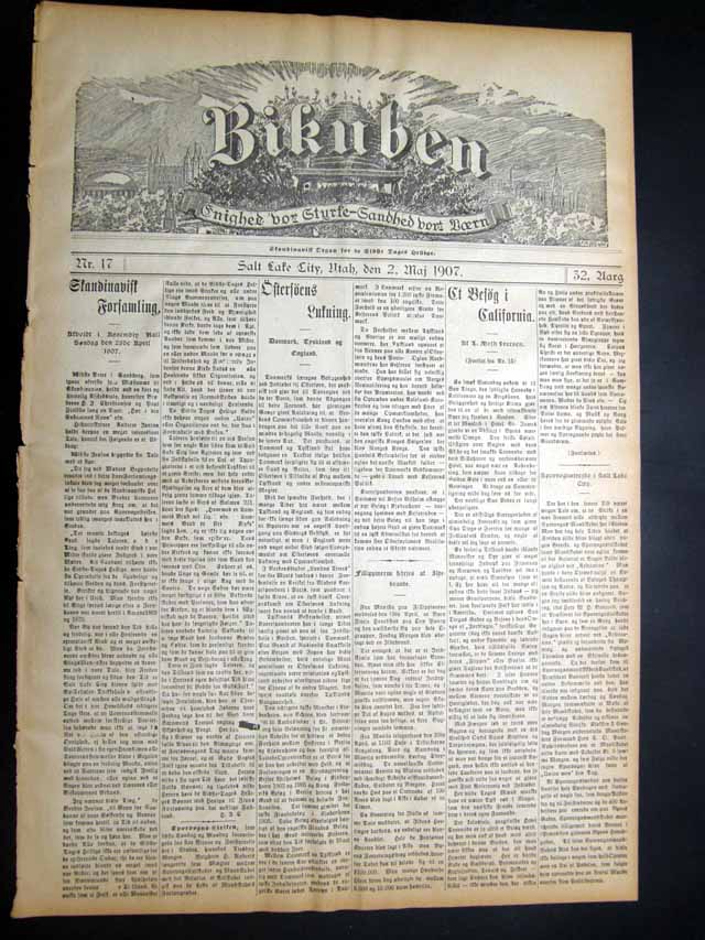This publication features and nice, decorative masthead that includes images of a beehive and the Mormon Temple. (see images) The beehive was a Mormon symbol which represented the kingdom of God and the title "Bikuben" is Danish for beehive.