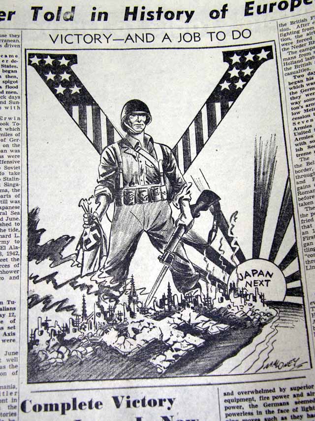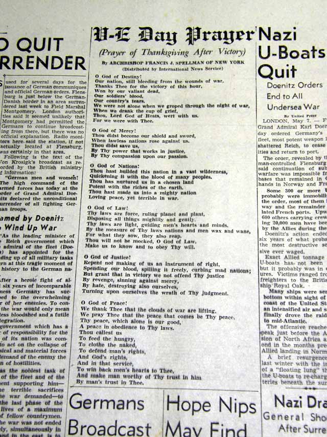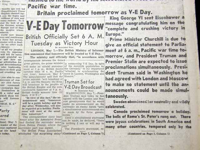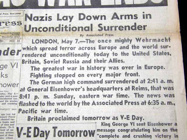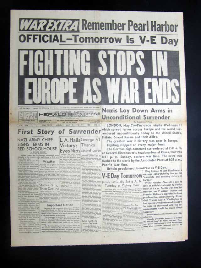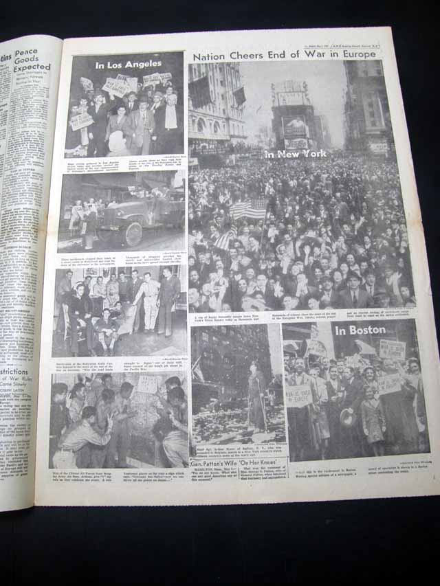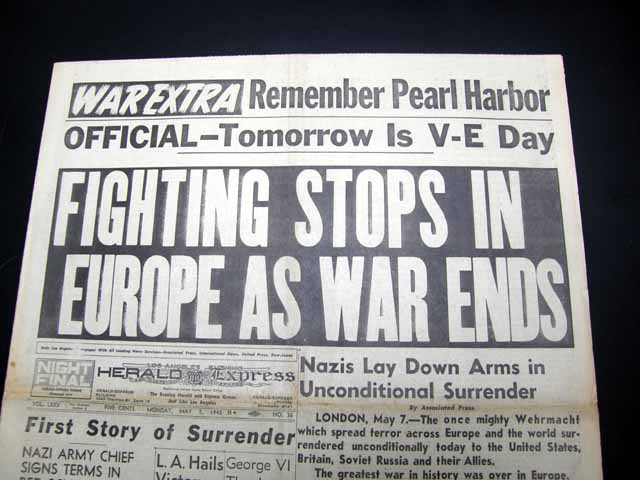 The bold banner headline with a black background above the masthead announces: "FIGHTING STOPS IN EUROPE AS WAR ENDS" with subheads. (see images) Nice for display. Two full page related pictorials on the inside pages.