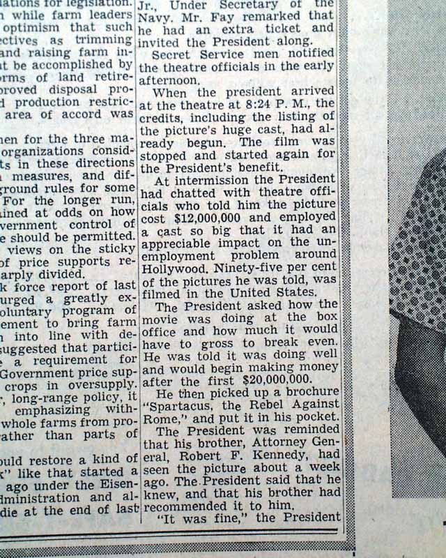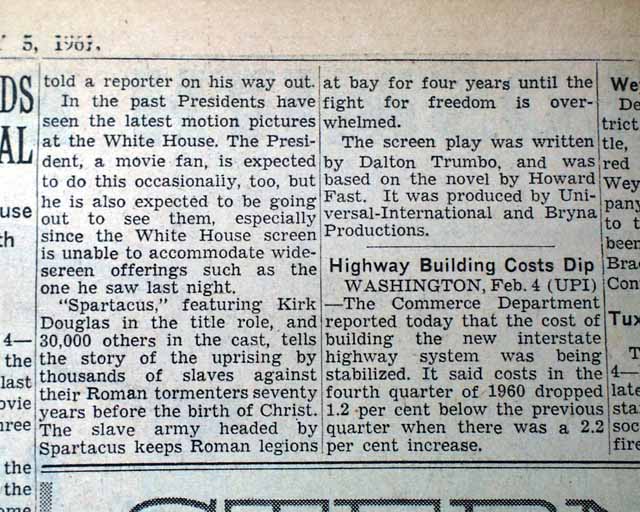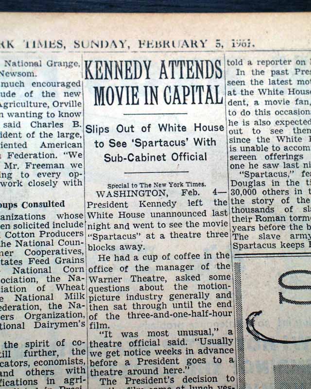 THE NEW YORK TIMES, Feb. 5, 1961 Page 39 has an "under-the-radar" report telling of JFK's attendance of the movie "Spartacus" at a local Washington, D.C. theater: "KENNEDY ATTENDS MOVIE IN CAPITAL", with subhead: "Slips Out of White House to See "Spartacus" With Sub-Cabinet Official". While appearing somewhat innocuous, his public action was perhaps the final blow to the McCarthyism Hollywood blacklist, and a resounding shout-out to freedom of speech. More can be read about this event on the History's Newsstand blog ("Popcorn, Principle, and the Presidency: JFK's Quiet Stand for Artistic Courage...".