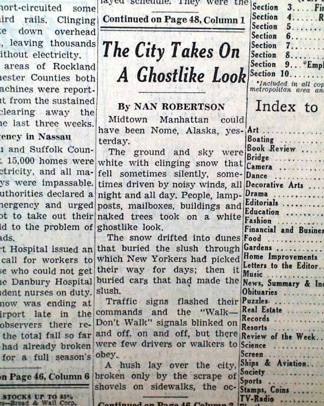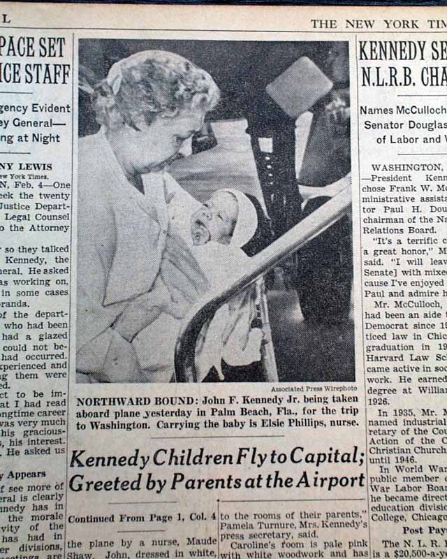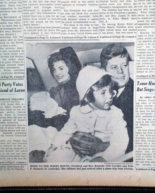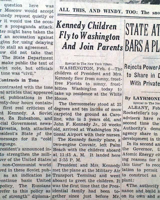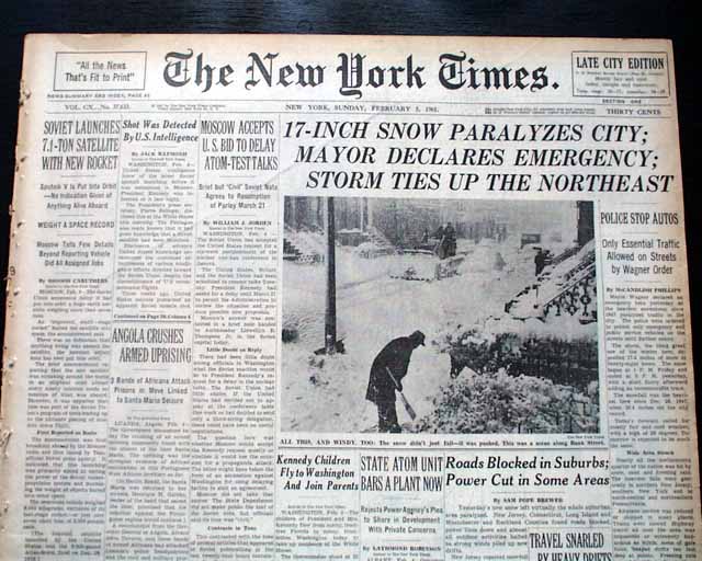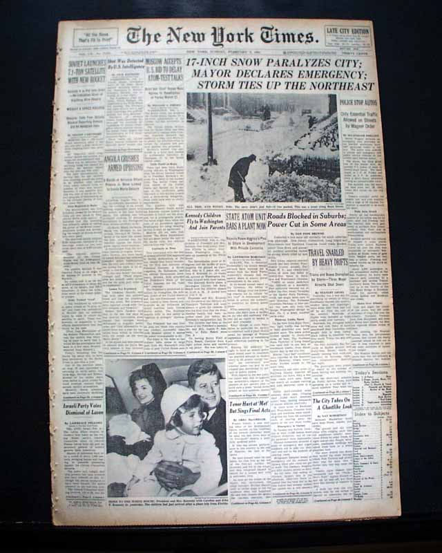 Among other interesting reports is the front page 6-column, 3-line heading: "17-INCH SNOW PARALYZES CITY: MAYOR DECLARES EMERGENCY; STORM TIES UP NORTHEAST" and "Kennedy Children Fly to Washington And Join Parents" - both which have corresponding photos. Other news, advertising, and sports is found throughout.