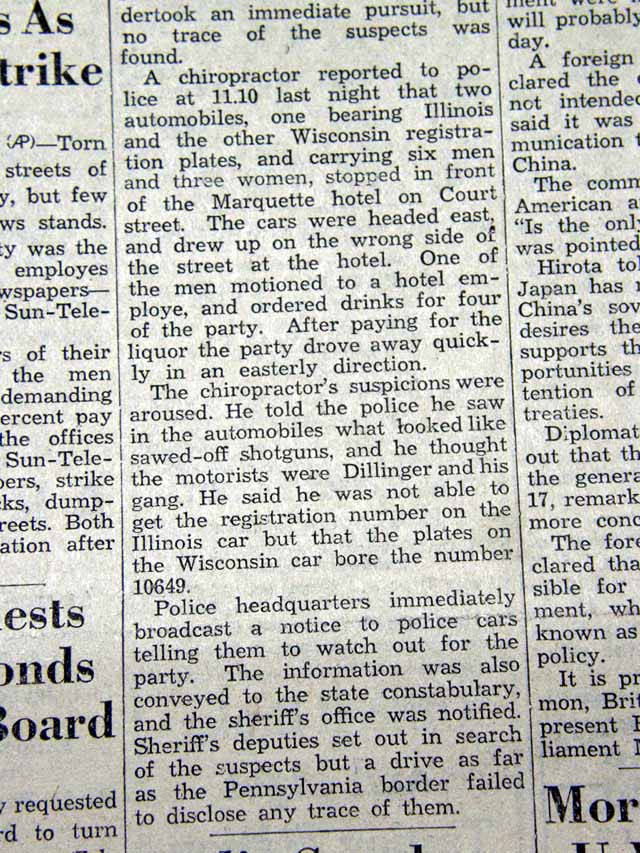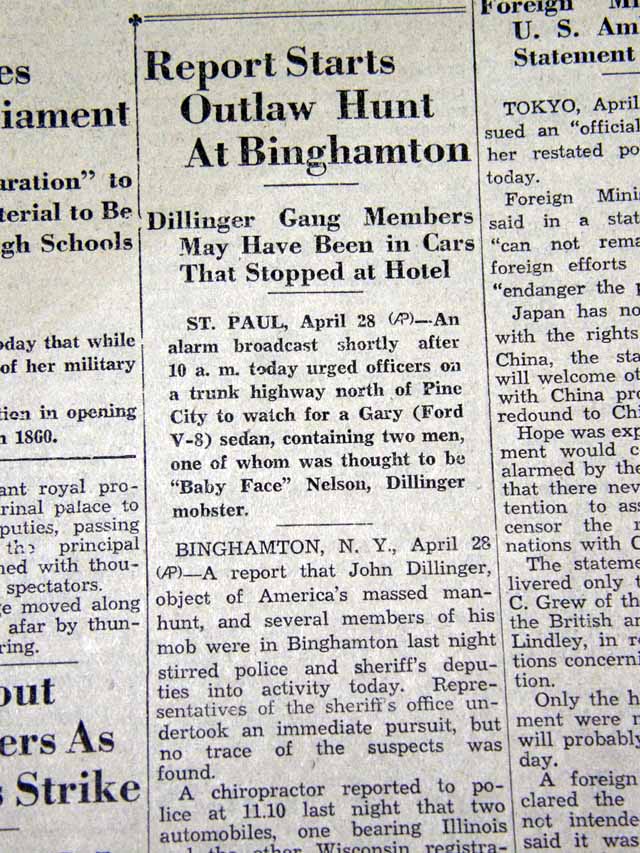 The front page has a one column heading: "Report Starts Outlaw Hunt At Binghamton" with subhead. (see images) Interesting report as Dillinger may have been sighted in Binghamton, New York, a few months before his death. Was it him? Probably not.