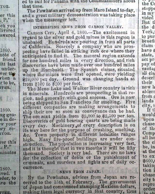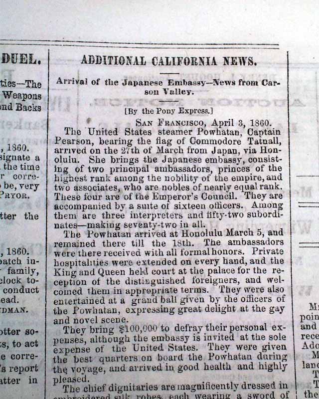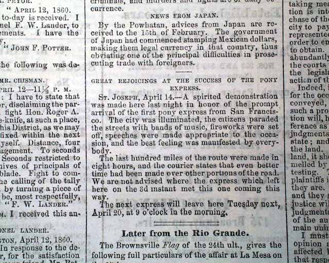 This reports on the first run of the famous Pony Express, and nice (uncommon) to have on the front page. Note: The Pony Express was a much-romanticized part of the American West, but lasted just 1 1/2 years before being displaced by the telegraph.