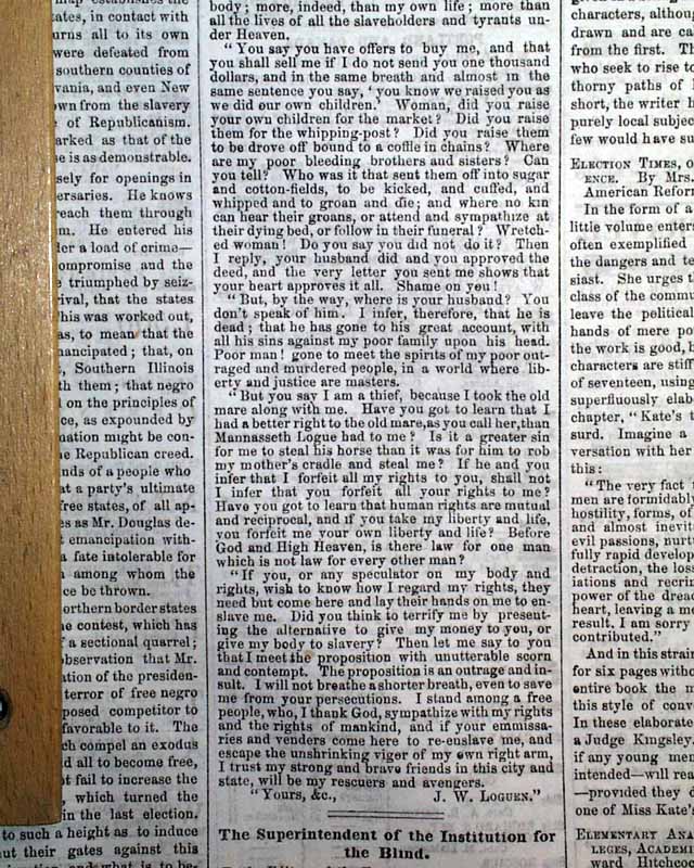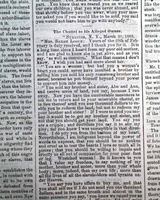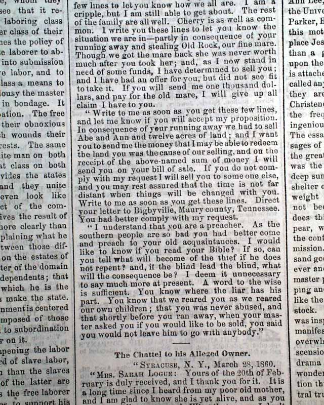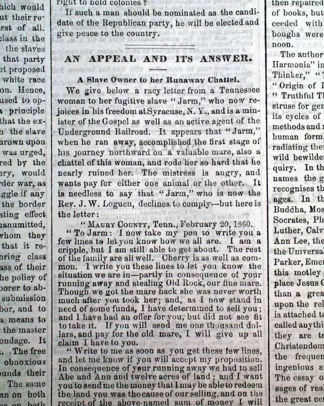 The first run of the Pony Express (two articles)... correspondence between a runaway slave and his "master"...
