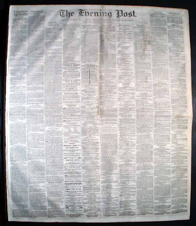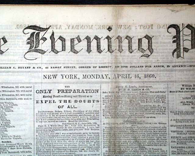 THE EVENING POST, New York, April 16, 1860  The front page has two historic reports related to the completion of the first-run of the Pony Express, the most notable being: "GREAT REJOICING AT THE SUCCESS OF THE PONY EXPRESS", which includes in part: "St. Joseph, April 14.- A spirited demonstration was made here last night in honor of the prompt arrival of the first Pony Express from San Francisco (with more)... The next express will leave here Tuesday next, April 20, at 9 o'clock in the morning." The second is: "ADDITIONAL CALIFORNIA NEWS... [By the Pony Express]", which is followed by several paragraphs of the first news successfully transported by the Pony Express. See images for details.