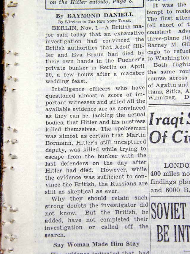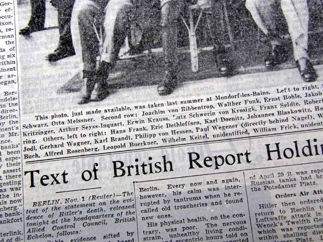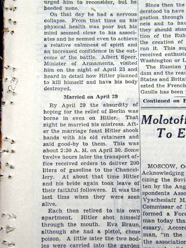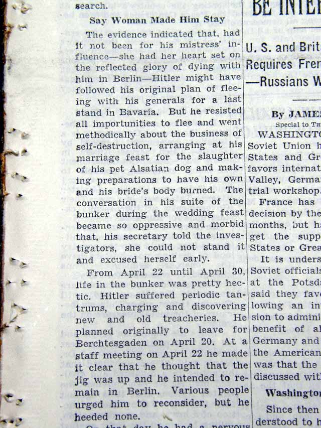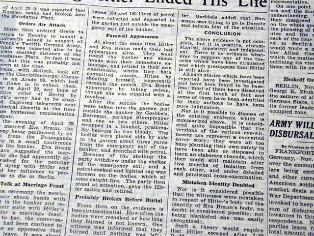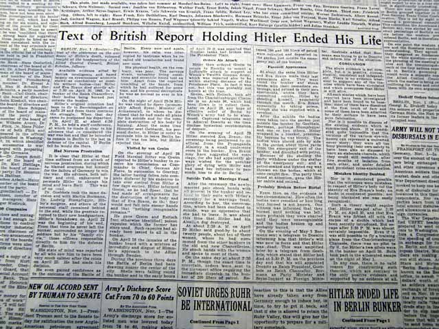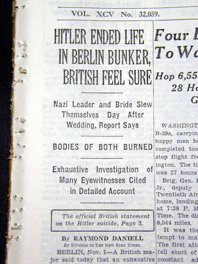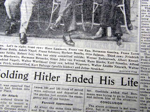 The top of the front page has a one column heading: "HITLER ENDED LIFE IN BERLIN BUNKER, BRITISH FEEL SURE" with subhead. (see images)