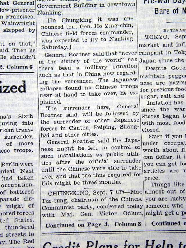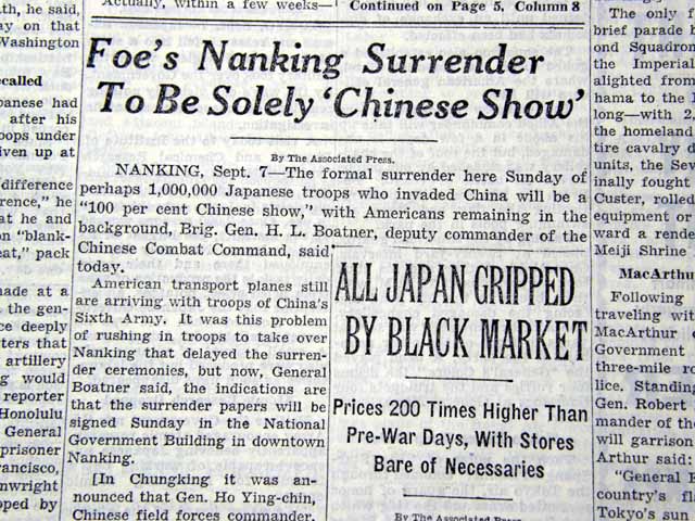 The front page has a two column heading: "Foe's Nanking Surrender To Be Solely 'Chinese Show'" (see images)