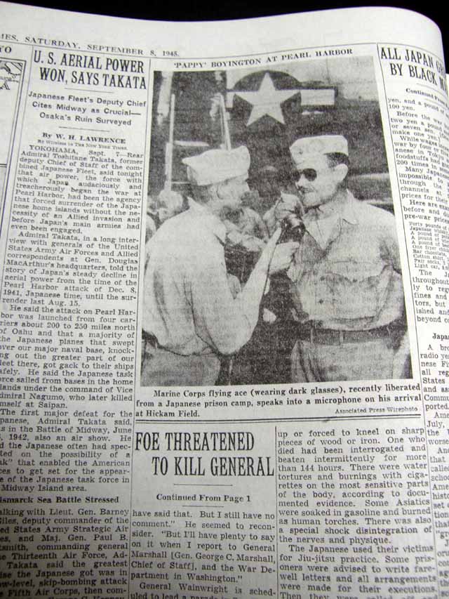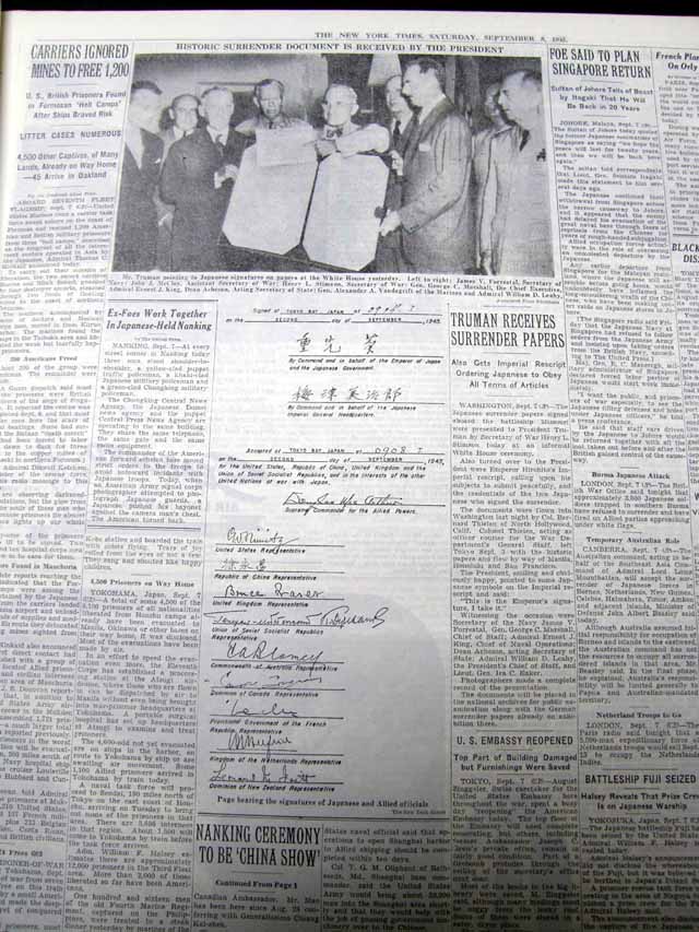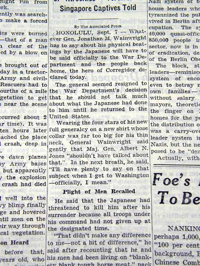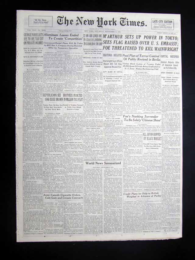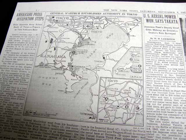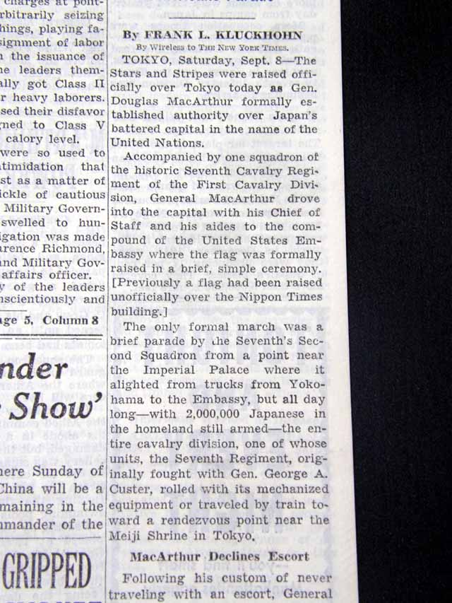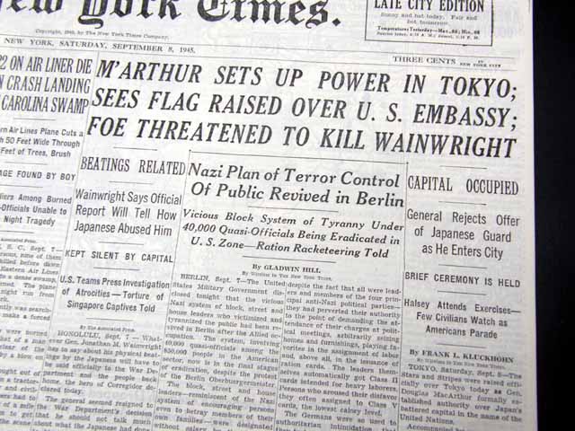 Also, the top of the front page has a four column headline: "M'ARTHUR SETS UP POWER IN TOKYO; SEES FLAG RAISED OVER U.S. EMBASSY; FOE THREATENED TO KILL WAINWRIGHT" with subheads. (see) Nice in this famous NYC publication.