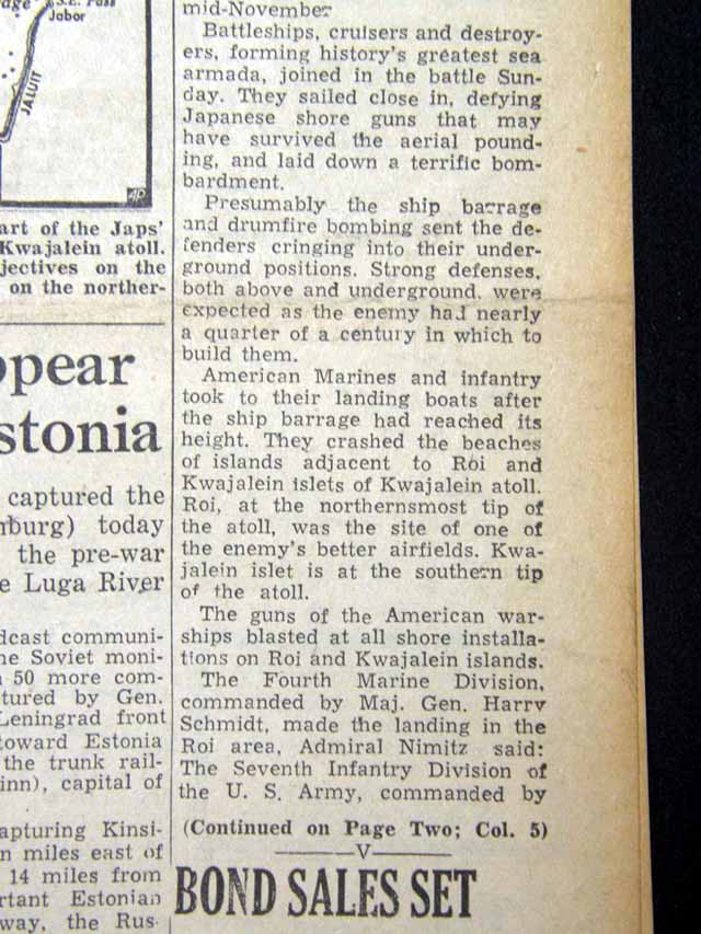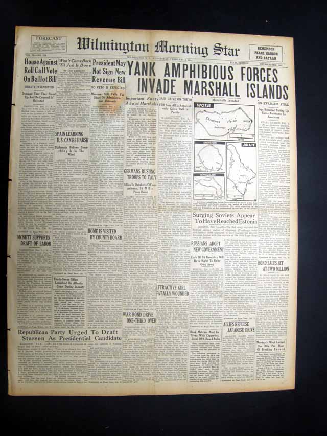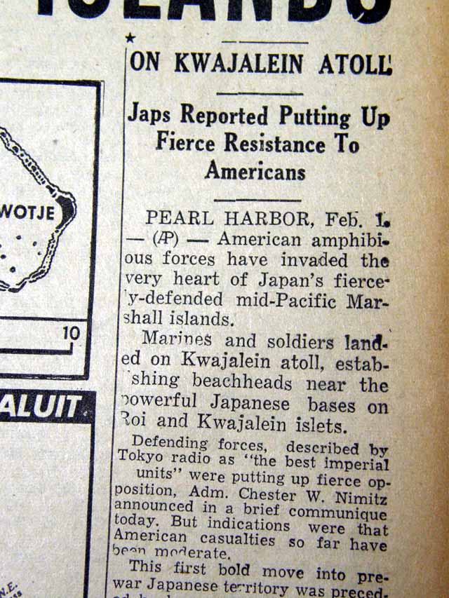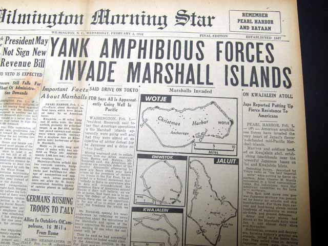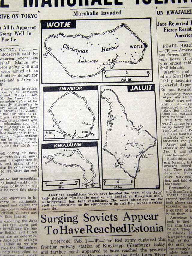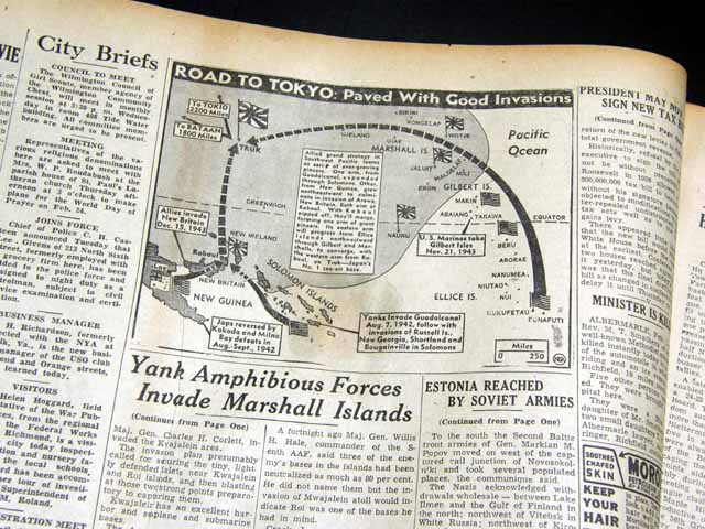 The top of the front page has a five column headline: "YANK AMPHIBIOUS FORCES INVADE MARSHALL ISLANDS" with subheads and related map. (see images)