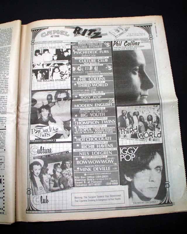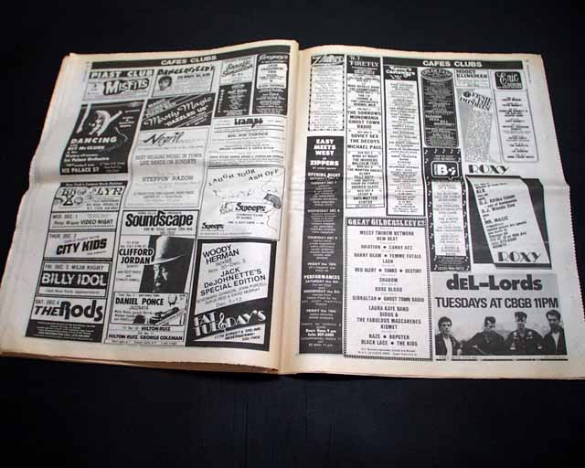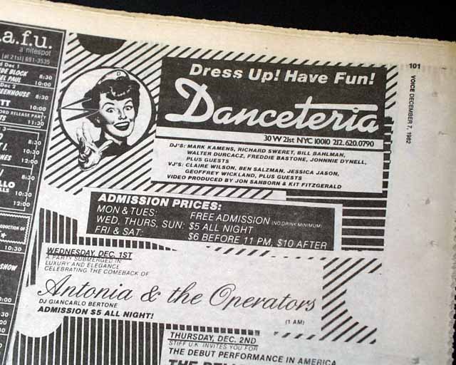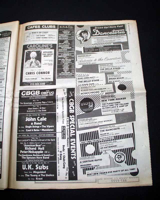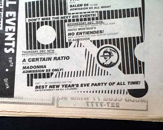 Page 101 has an advertisement for upcoming performances at the Danceteria nightclub in New York City with a midnight performance by a very young "Madonna". (see images) Of course this mention of her is small and discrete here because she was still unknown at the time. Madonna was living in this part of Manhattan at the time, so this publication is very likely the only one to carry such an ad. See the following description of this legendary performance below.