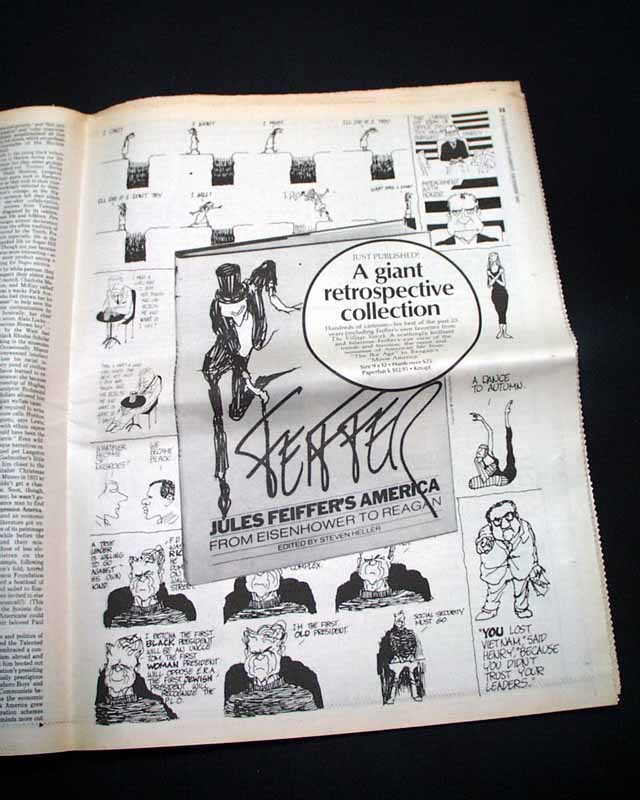 The Village Voice was an American counterculture newspaper known for being the country's first alternative newsweekly. It introduced free-form, high-spirited, and passionate journalism into the public discourse - a tradition it maintained throughout its 60+ year history. It is quite common to find great political cartoons, satirical cartoons and articles, thought-provoking editorials, and ads and reviews for both concerts and theater productions - both on and off Broadway. Many iconic writers and musicians credit their appearance in The Village Voice for at least a portion of their success.