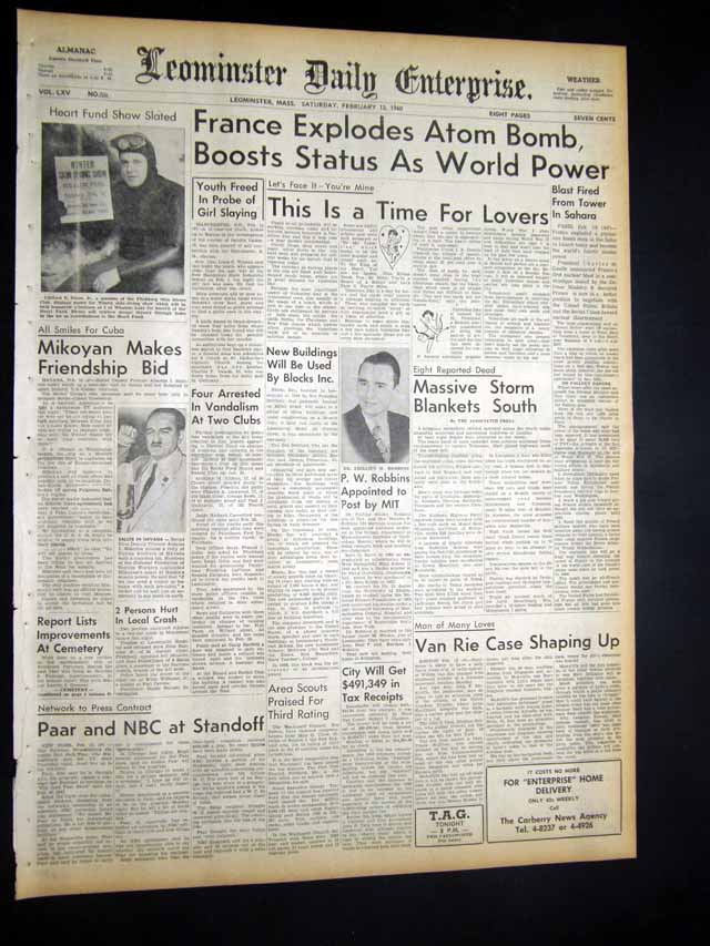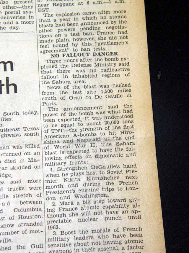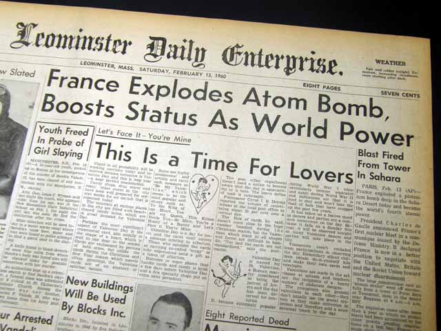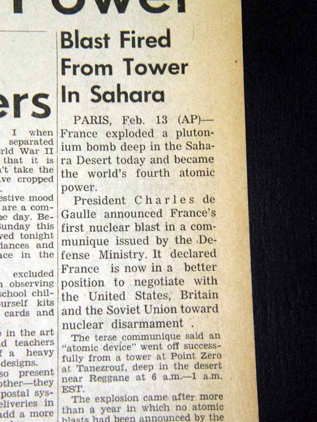 The top of the front page has a six column headline: "France Explodes Atom Bomb, Boosts Status As World Power" with subhead. (see images)