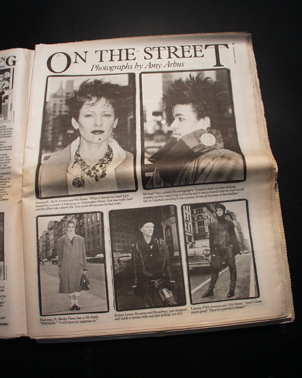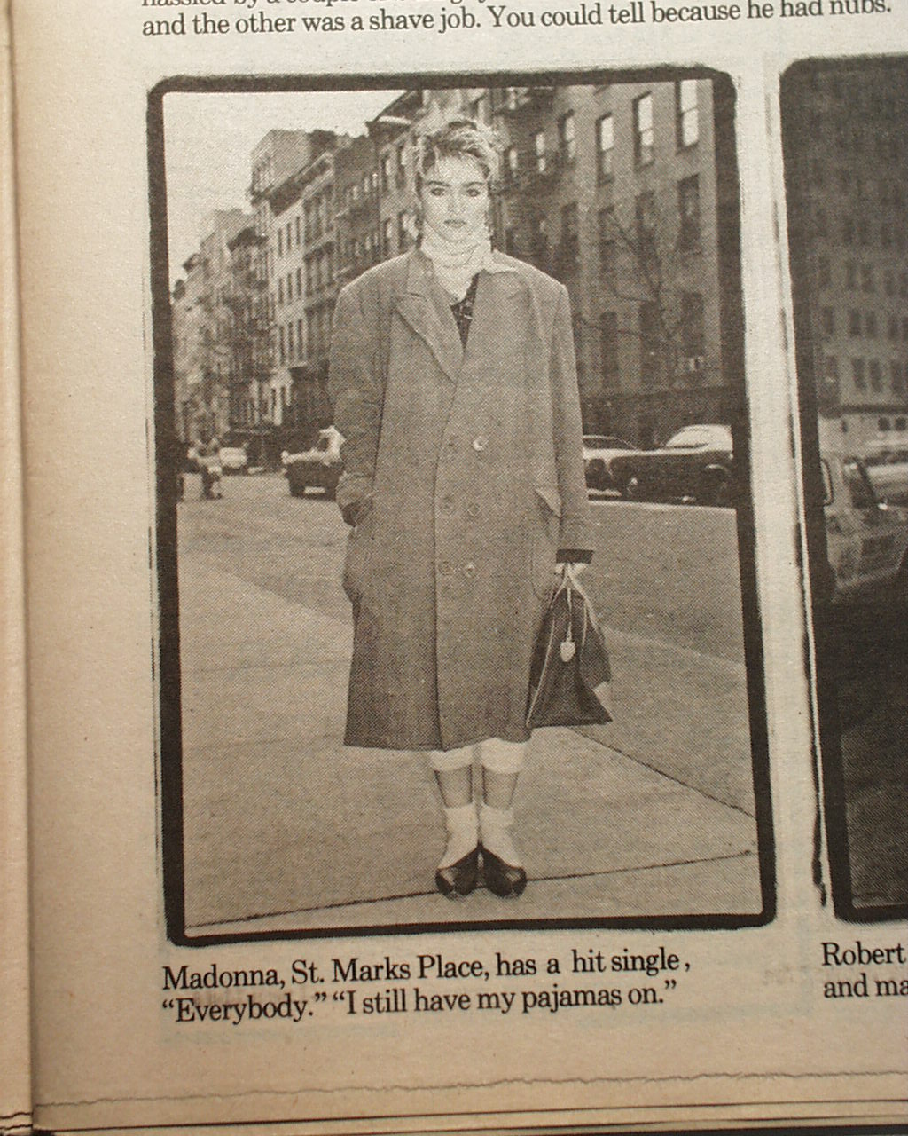 AI notes: The first known photograph of Madonna published in The Village Voice as a musician (post modeling career) was on February 8, 1983, The Village Voice featured a photo of Madonna in its "On the Street" column by Amy Arbus. Taken on St. Marks Place, the image showed Madonna in a distinctive outfit during the same week her debut single "Everybody" was released. The candid photo captured her early style and became iconic in both her career and 1980s street fashion. Arbus’s column ran from 1980–1990, spotlighting unique, standout individuals from New York’s cultural scene. This photograph captures Madonna at a pivotal moment in her career, just as she was beginning to gain recognition in New York City's vibrant music scene.