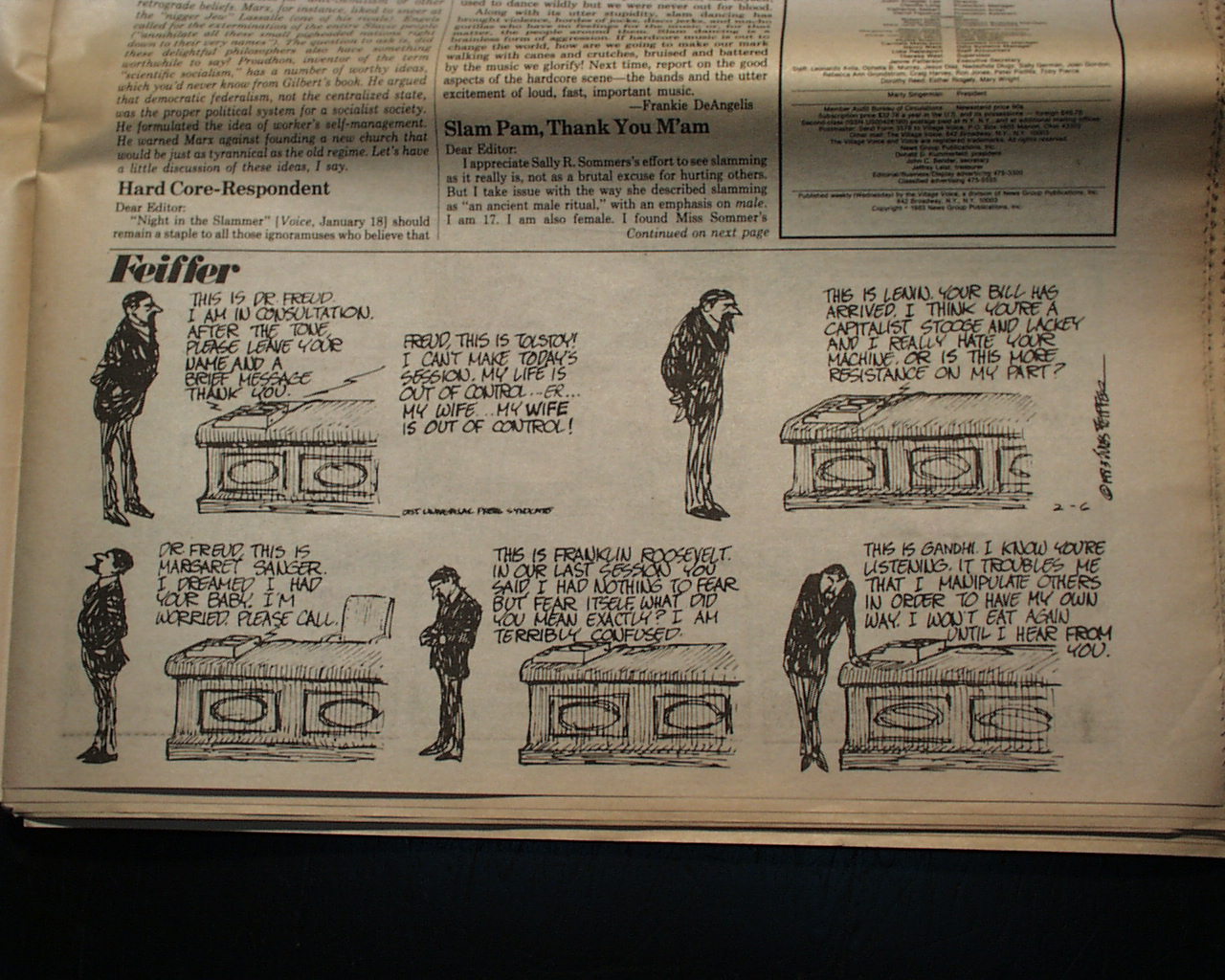 The Village Voice was an American counterculture newspaper known for being the country's first alternative newsweekly. It introduced free-form, high-spirited, and passionate journalism into the public discourse - a tradition it maintained throughout its 60+ year history. It is quite common to find great political cartoons, satirical cartoons and articles, thought-provoking editorials, and ads and reviews for both concerts and theater productions - both on and off Broadway. Many iconic writers and musicians credit their appearance in The Village Voice for at least a portion of their success.