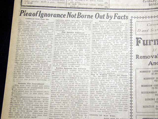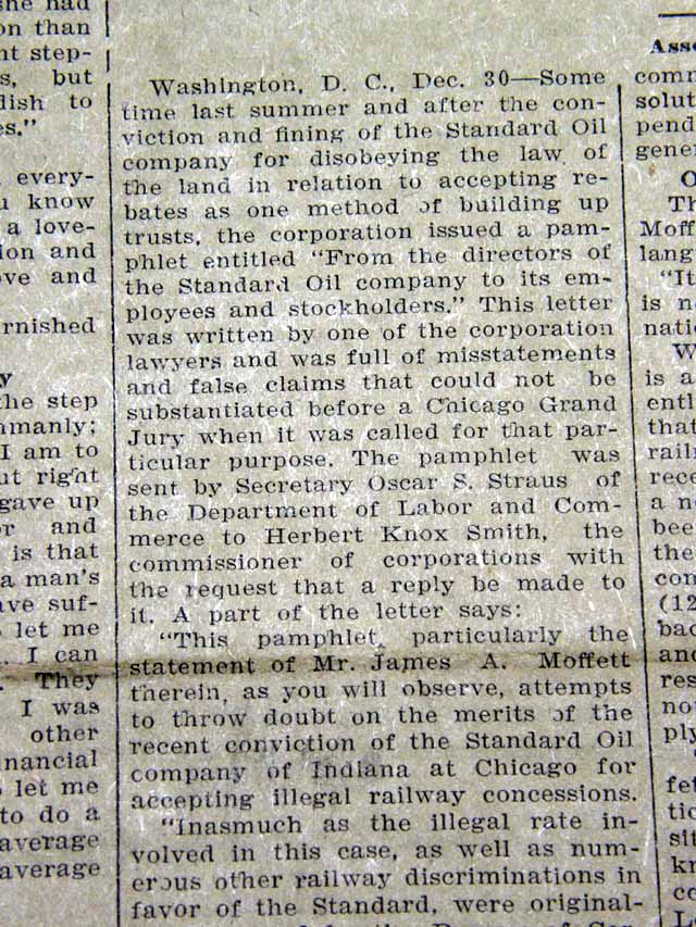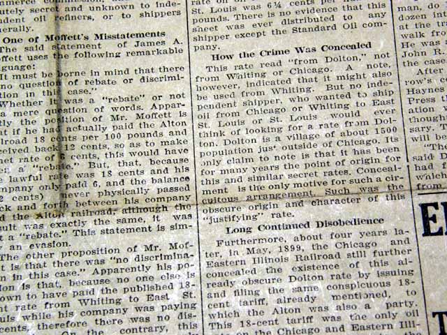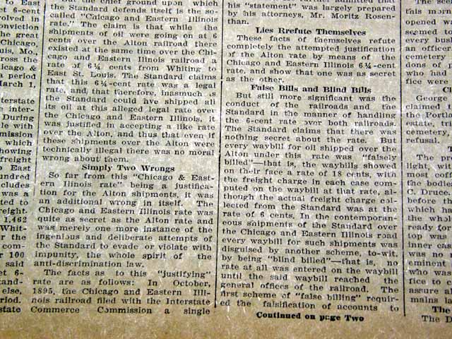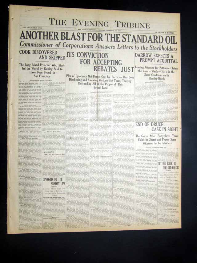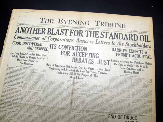 The front page has a nice banner headline: "ANOTHER BLAST FOR THE STANDARD OIL; Commissioner of Corporations Answers Letters to the Stockholders" with subheads. (see images) Nice for display. Surprisingly this issue is in good condition being from the "wood pulp" era. Very hard to find issues that are not totally fragile from this era in paper.