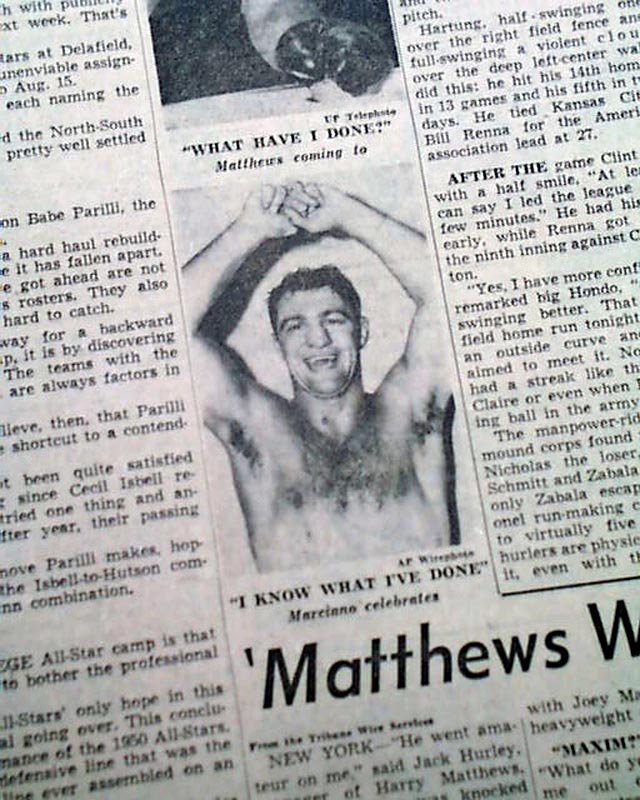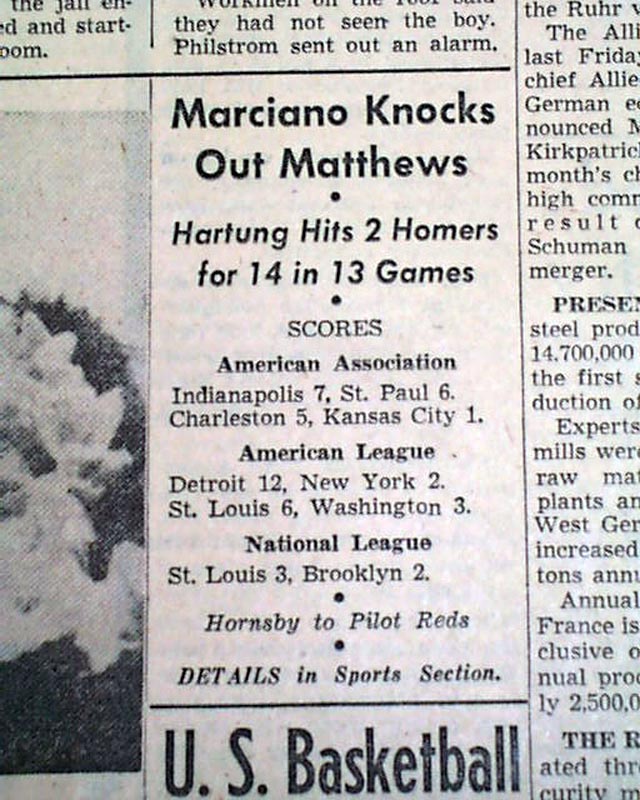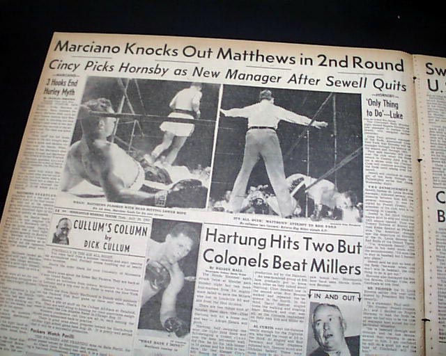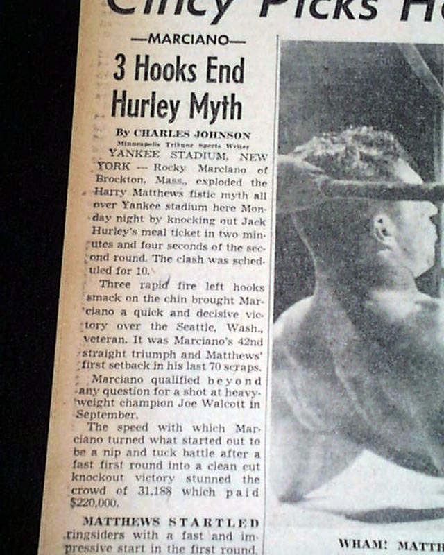 The top of page 14 has a banner heading: "Marciano Knocks Out Matthews in 2nd Round" with subheads and four related photos. (see images)