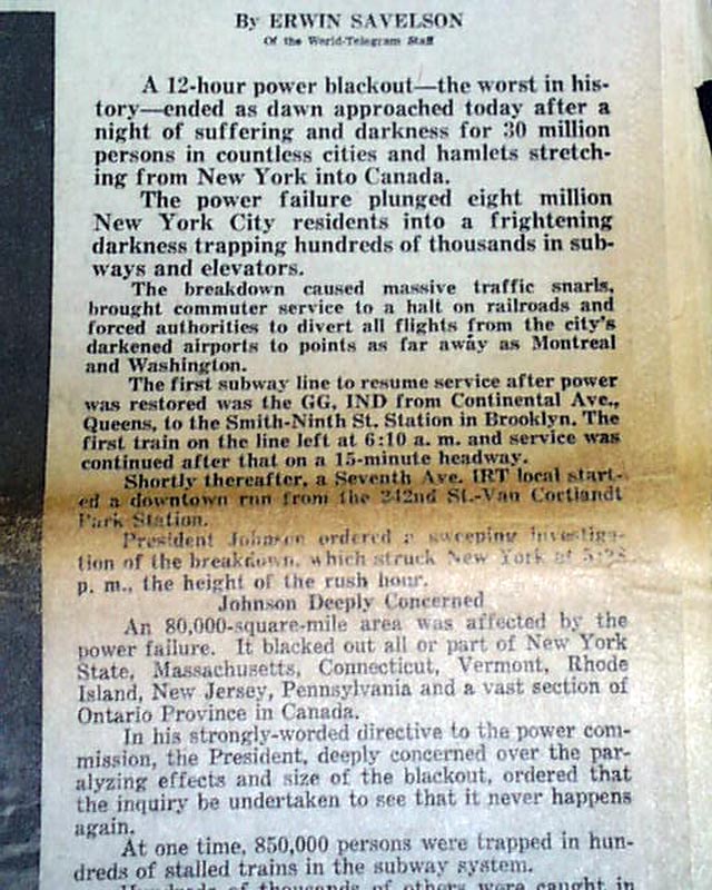 AI notes: On November 9, 1965, New York City experienced a sudden and extensive blackout that struck around 5:27 p.m., plunging much of Manhattan, Brooklyn, Queens, and parts of the Bronx into darkness during the evening rush hour. Streetlights, traffic signals, and subway systems went offline, leaving tens of thousands of commuters stranded in darkened stations and on streets, while businesses and offices were forced to halt operations abruptly. Despite fears of chaos, the city largely remained orderly, though some reports of minor looting and disturbances emerged in a few neighborhoods. Emergency services were stretched but managed to respond effectively, directing traffic manually and assisting stranded citizens. Power was gradually restored over the next several hours, with some areas waiting up to 13 hours, and the blackout highlighted vulnerabilities in the city’s electrical infrastructure, prompting utilities and city planners to implement stronger grid management and emergency preparedness measures in the years that followed.