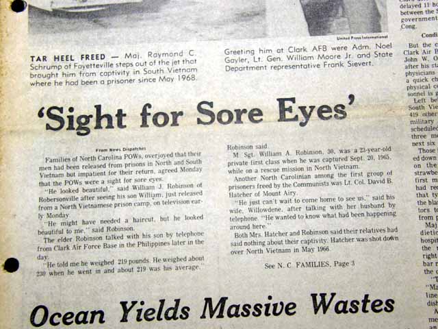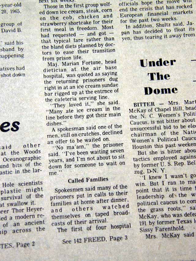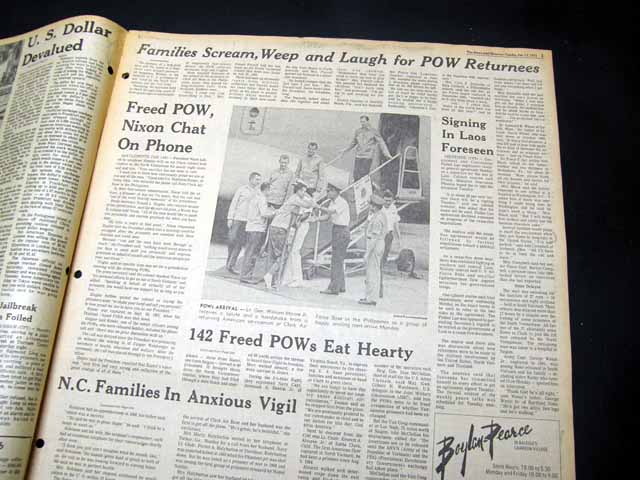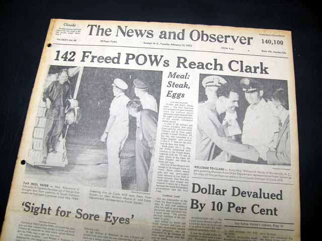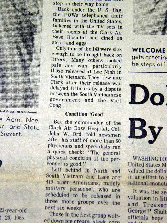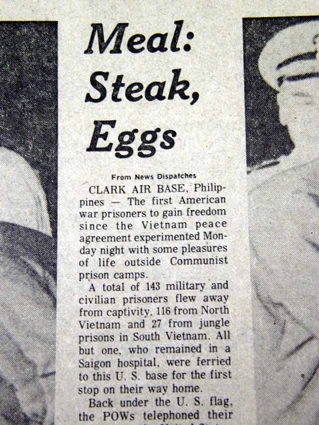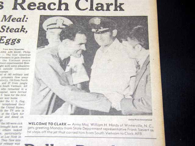 The front page has a banner headline: "142 Freed POWs reach Clark" with subheads and two related photos. (see images) More on page 3.