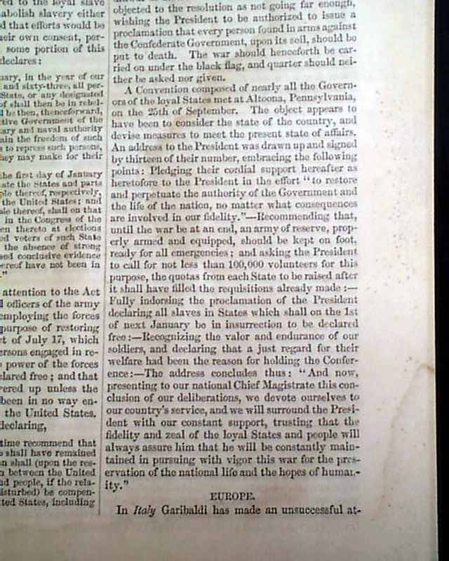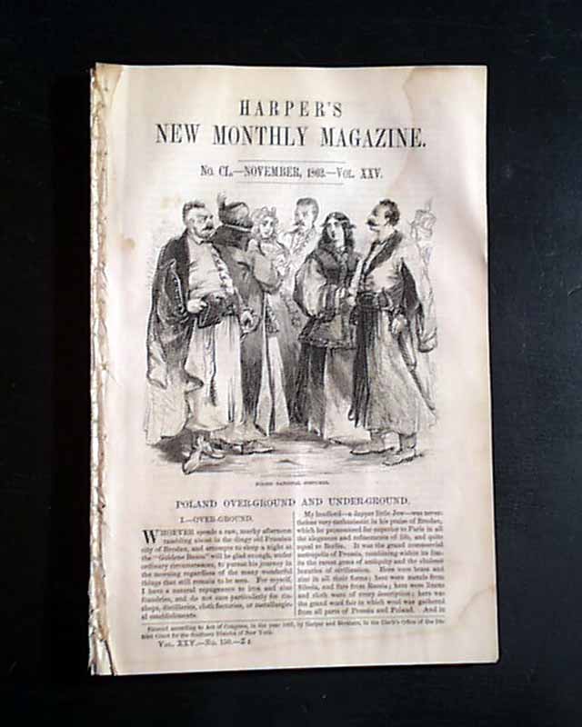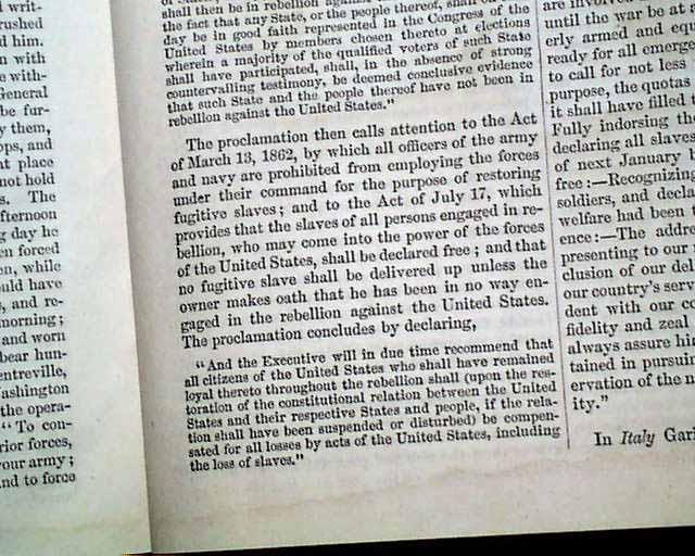 Item # 720646 HARPER'S NEW MONTHLY MAGAZINE, New York, November, 1862 Near the back of the issue under "Monthly Record of Current Events" is a report on the Emancipation Proclamation. "On the 22d of September the President issued a very important proclamation. ... that he should at the next meeting of Congress again urge that pecuniary compensation be tendered to the loyal slave States should they choose to abolish slavery either gradually or immediately... the proclamation declares..." and what follows are the notable excerpts of the actual Preliminary Emancipation Proclamation document by Lincoln, including: "That on the first day of January...all persons held as slaves within any state...the people whereof shall then be in rebellion against the United States shall be e then...forever free..." with more (see). This is then followed by editorial commentary including: "This emancipation proclamation caused great excitement in the Confederate Congress at Richmond...".