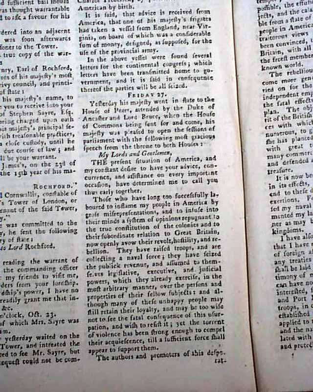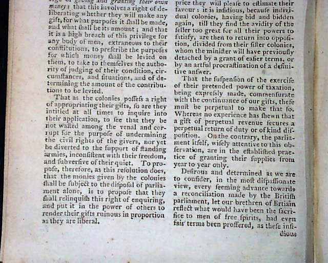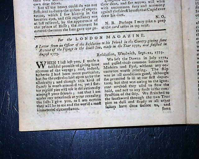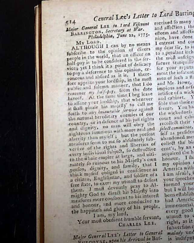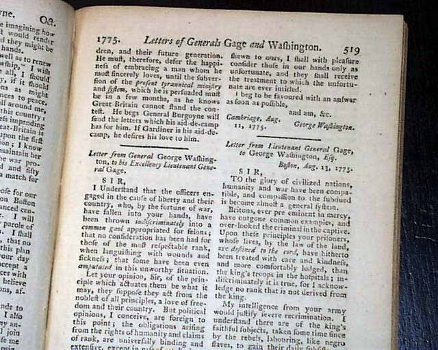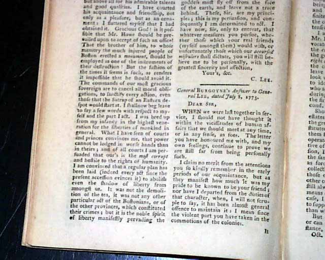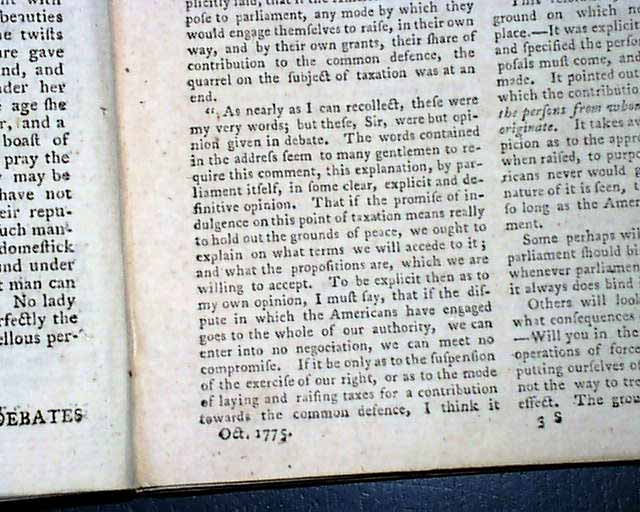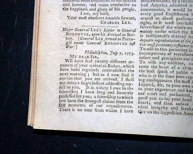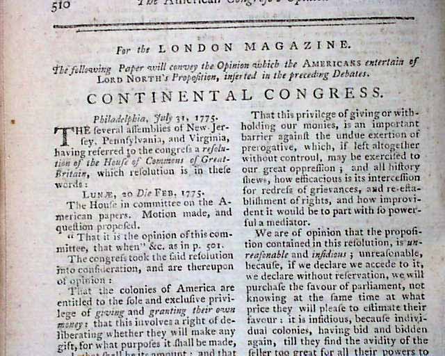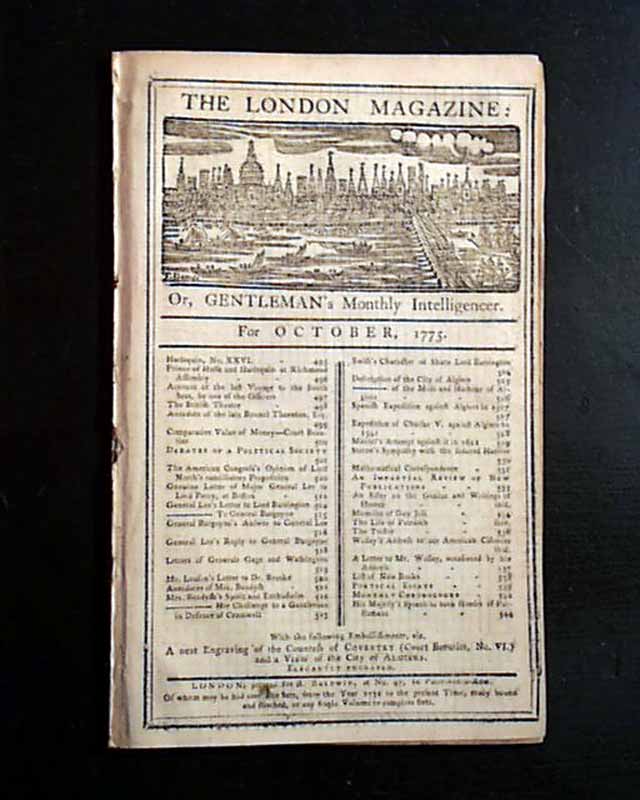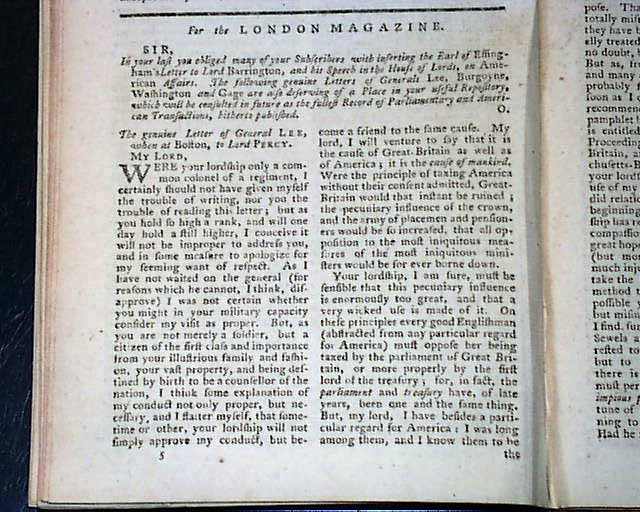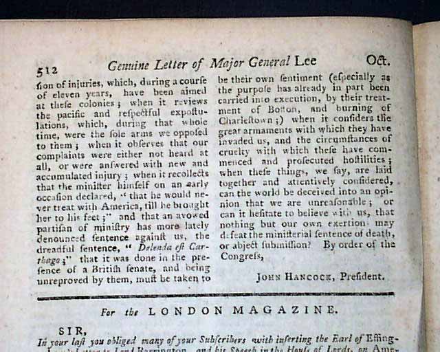 THE LONDON MAGAZINE, England October, 1775 Over 2 pages area taken up with the document--signed in type by John Hancock--in which the Continental Congress rejects the conciliation plan of Lord North. The document is headed: "CONTINENTAL CONGRESS". See for portions. This is followed by a number of letters from notables of the Revolutionary War including one from General Lee (at Boston) to Lord Percy; another letter signed: Charles Lee to Viscount Barrington dated at Phila., another lengthy letter from Lee at Phila. to General Burgoyne; General Burgoyne's Answer to General Lee; General Lee's letter declining a meeting with General Burgoyne; a letter from General George Washington to General Gage, signed in italic type: George Washington; and a letter from General Gage to George Washington datelined at Boston.