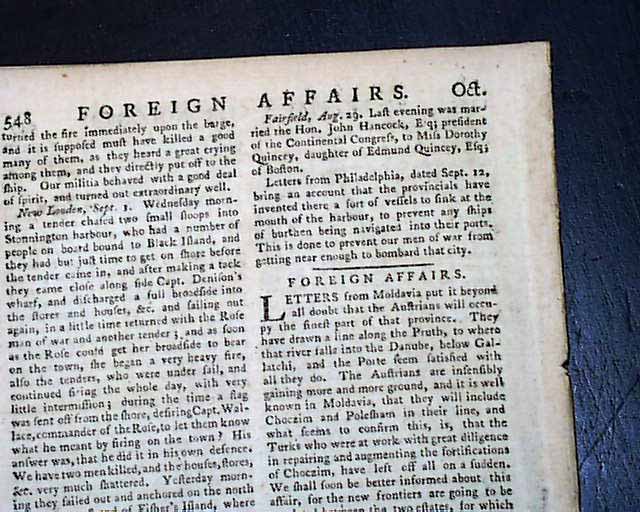 Near the back is additional American reports headed: "American Affairs" including a report that: "Last evening was married the Hon. John Hancock, Esq.; president of the Continental Congress, to Miss Dorothy Quincey, daughter of Edmund Quincey of Boston."
