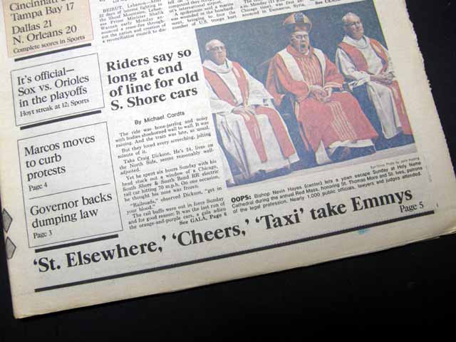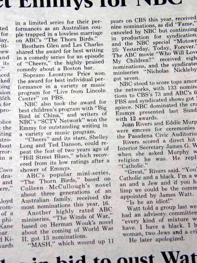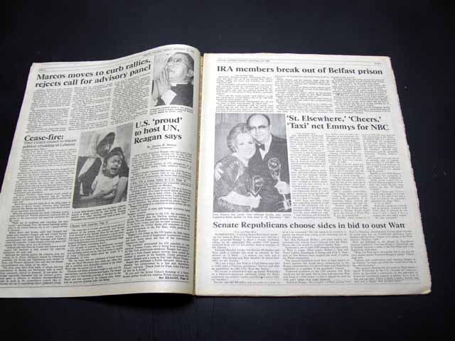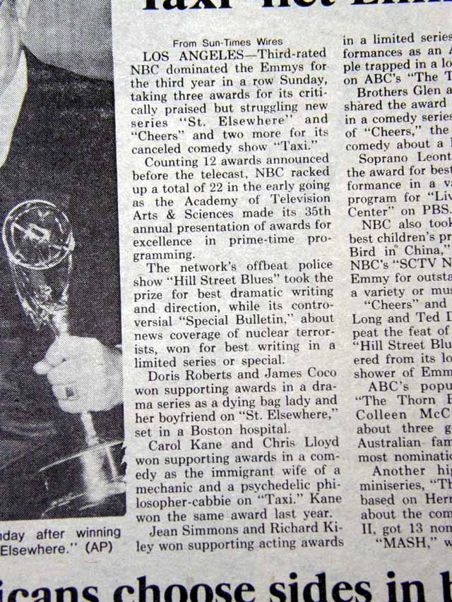 Page 5 has a heading: "'St. Elsewhere,' 'Cheers,' 'Taxi' net Emmys for NBC" and related photo. (see images)
