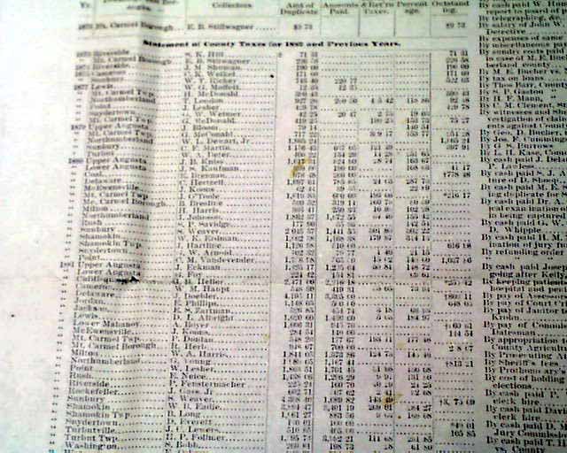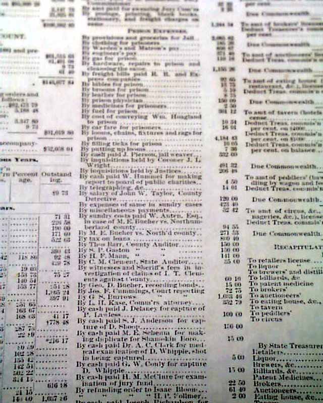 NORTHUMBERLAND PRESS--EXTRA, Pennsylvania  This is a broadside "Extra" containing various financial information in this "Auditor's Report of the Finances of Northumberland County for the Year 1882".