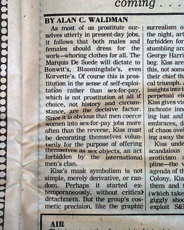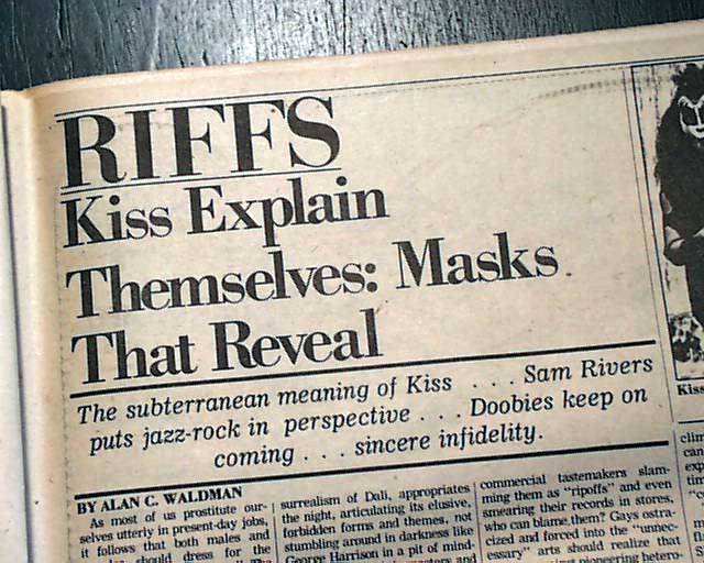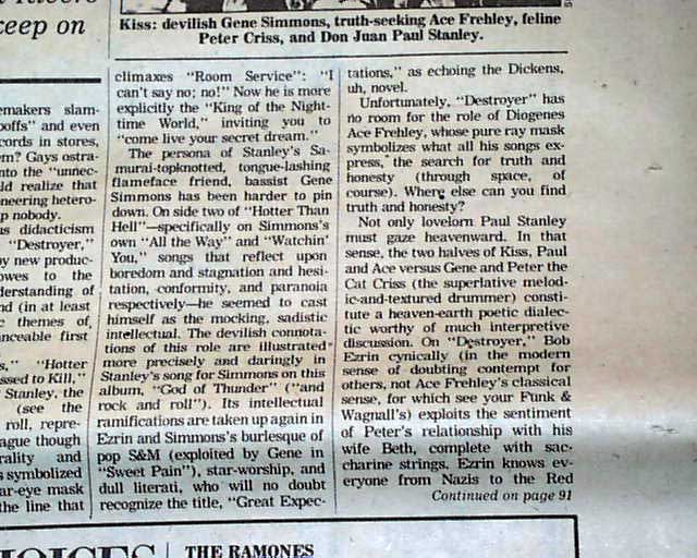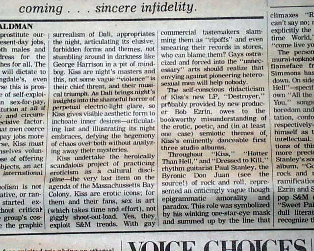 The top of page 89 has a heading under "RIFFS" that reads: "Kiss Explain Themselves: Masks That Reveal" with subhead and photo of the group in full makeup. This was the time near the beginning of their "Destroyer Tour". This is also the first KISS related item I found in a Village Voice issue that wasn't a advertisement for a concert or album release.