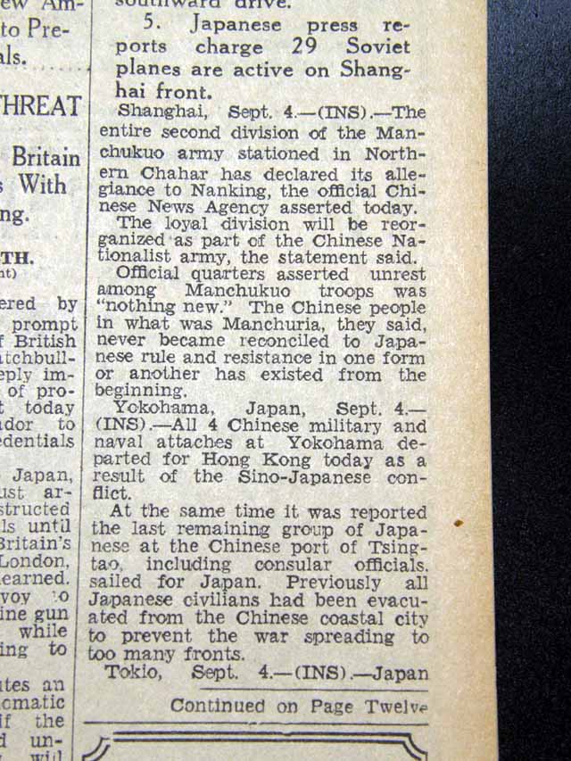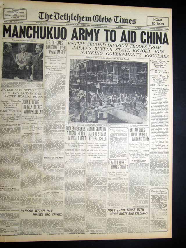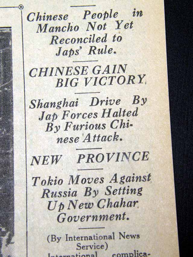 The top of the front page has a banner headline for display: "MANCHUKUO ARMY TO AIF CHINA" with various subheads and related photo. (see images)