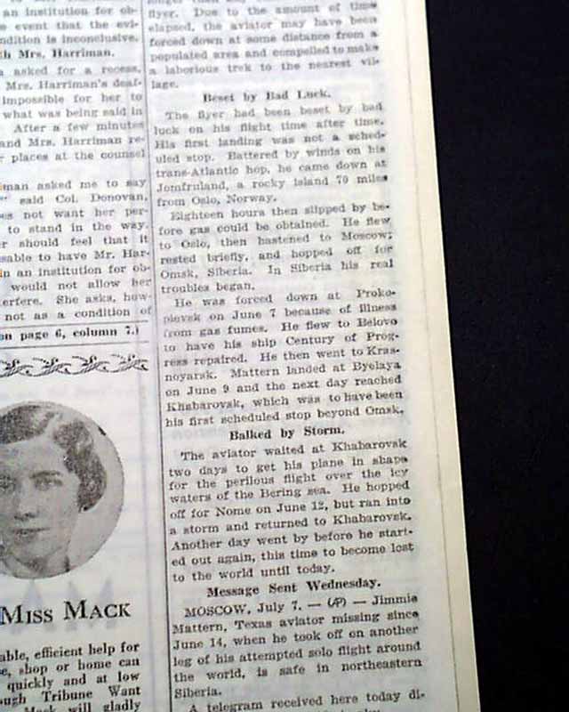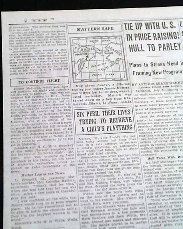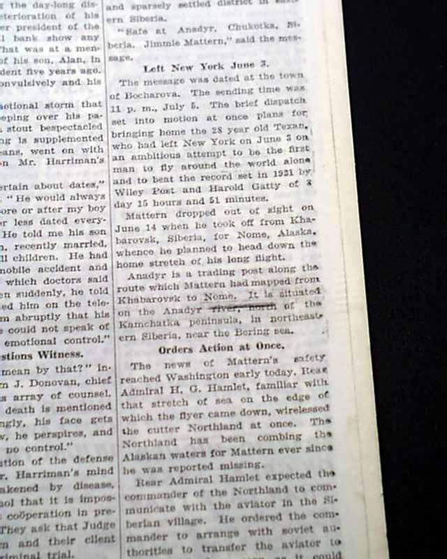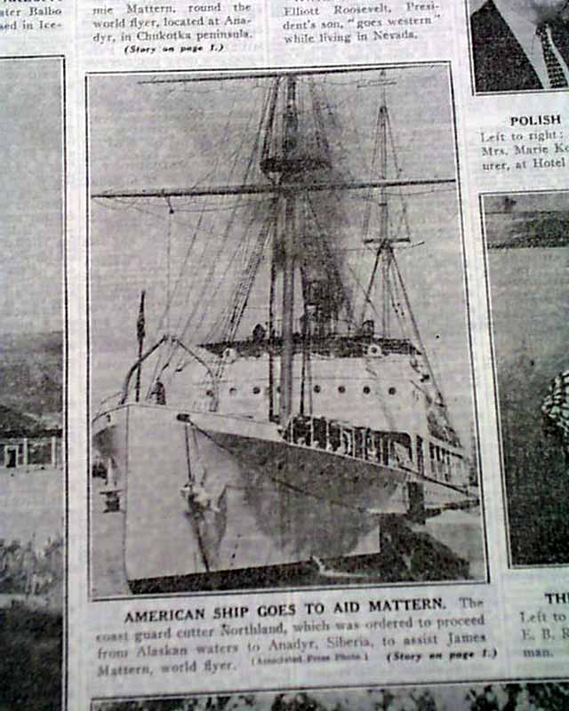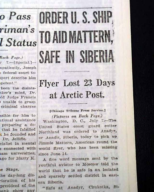 The front page has a one column heading: "ORDER U. S. SHIP TO AID MATTERN, SAFE IN SIBERIA" with subhead. Two related photos are on the back page. (see images)