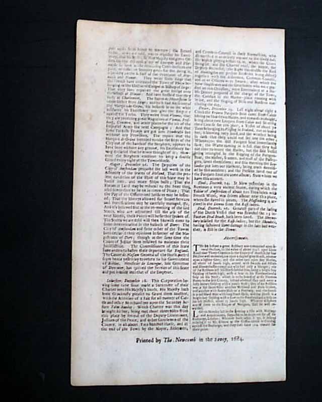 The issue is filled with various news of the day from various cities in Europe, each report with its own dateline, and even includes a few "Advertisements" on the back page. Given its small size this would be a nice newspaper for framing & display with the 341 year old date prominent at the top. Nice condition.