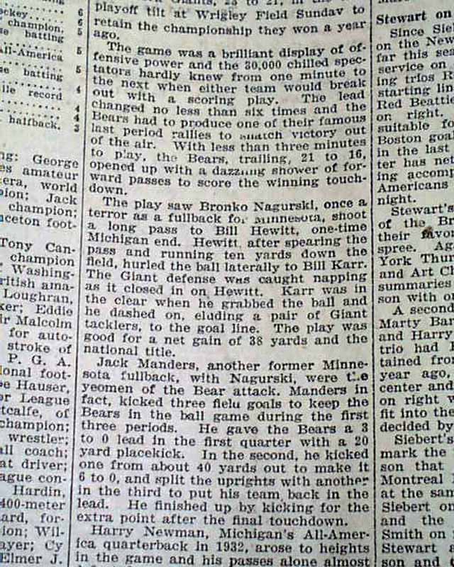 AI notes: The 1933 NFL Championship Game, held on December 17 at Wrigley Field in Chicago, was the league’s first officially scheduled title game under its new divisional format, featuring the Western Division champion Chicago Bears against the Eastern Division champion New York Giants. A crowd of around 25,000 witnessed a tightly contested and dramatic matchup, with the Bears ultimately winning 23–21. The game was highlighted by the versatility of Bronko Nagurski, who not only powered through defenses as fullback but also threw a touchdown pass to rookie Bill Karr, who later scored the decisive touchdown on a lateral in the final moments. Jack Manders contributed three crucial field goals that kept the Bears in contention throughout. This inaugural championship set the standard for the NFL postseason, combining strategic innovation, individual heroics, and suspenseful finishes, and it remains celebrated as a defining moment in early professional football history.