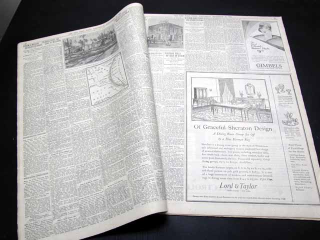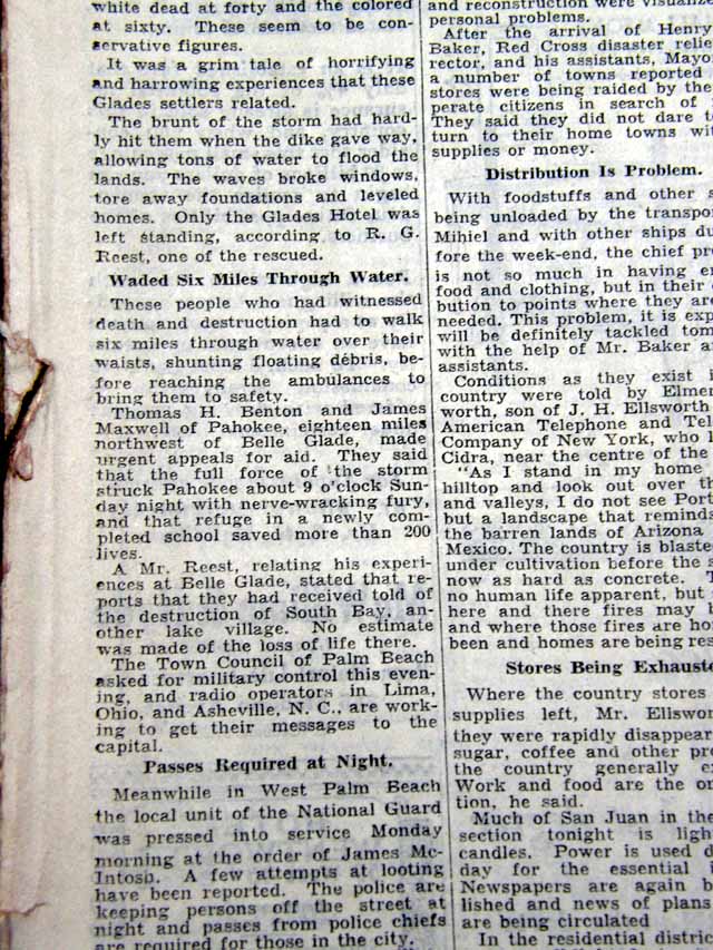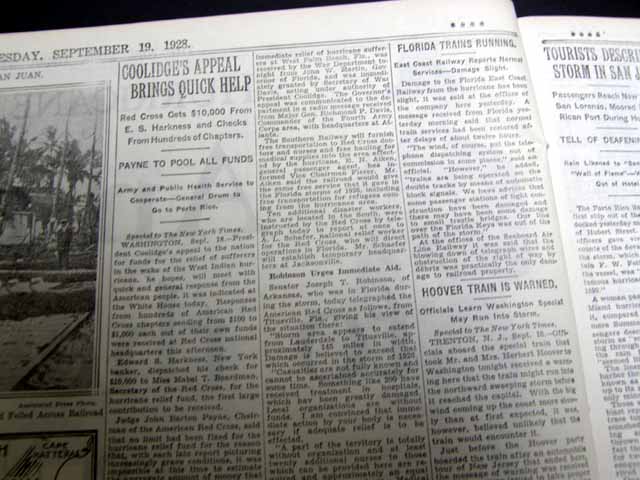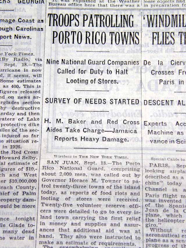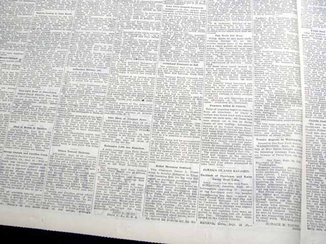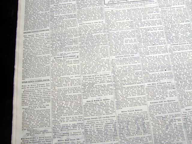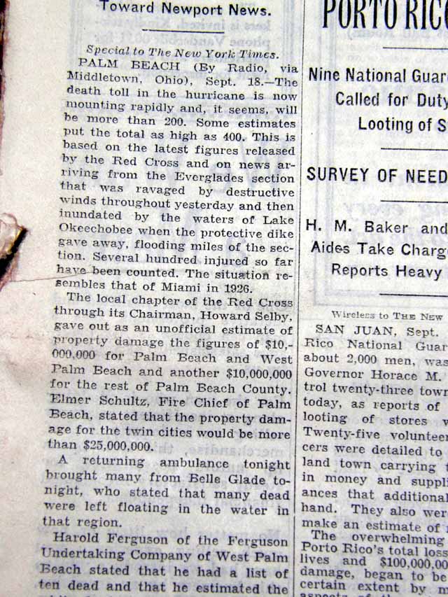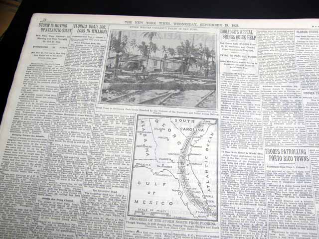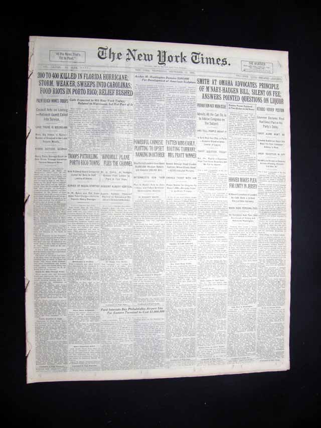 The top of the front page has a three column headline: "200 TO 400 KILLED IN FLORIDA HURRICANE; STORM, WEAKER, SWEEPS INTO CAROLINAS; FOOD RIOTS IN PORTO RICO; RELIEF RUSHED" with subheads. (see) Lengthy coverage continues inside with related photo and map. Always nice to have notable events in history reported in this World famous publication.