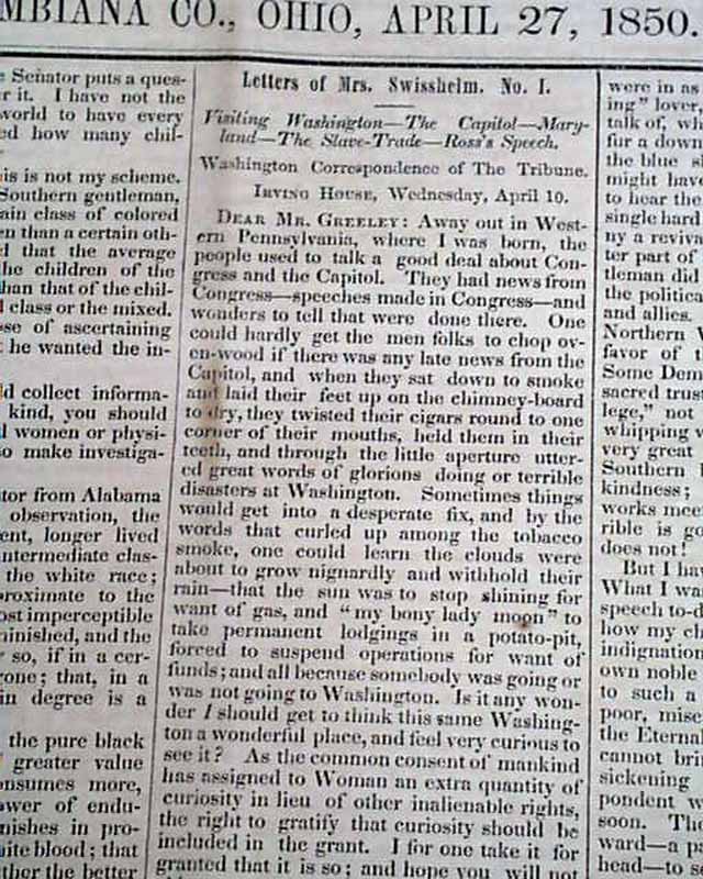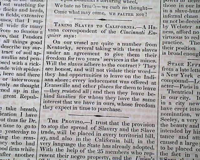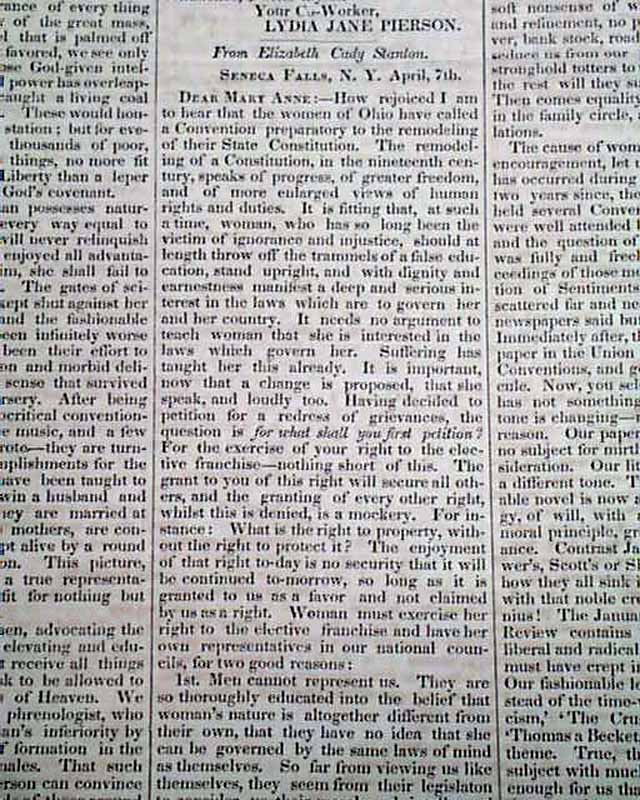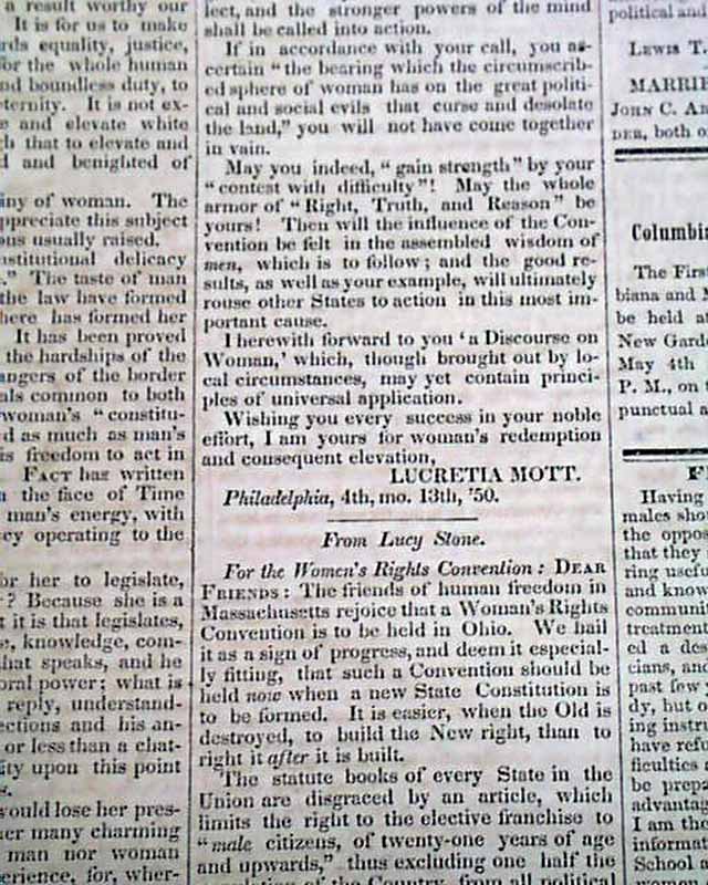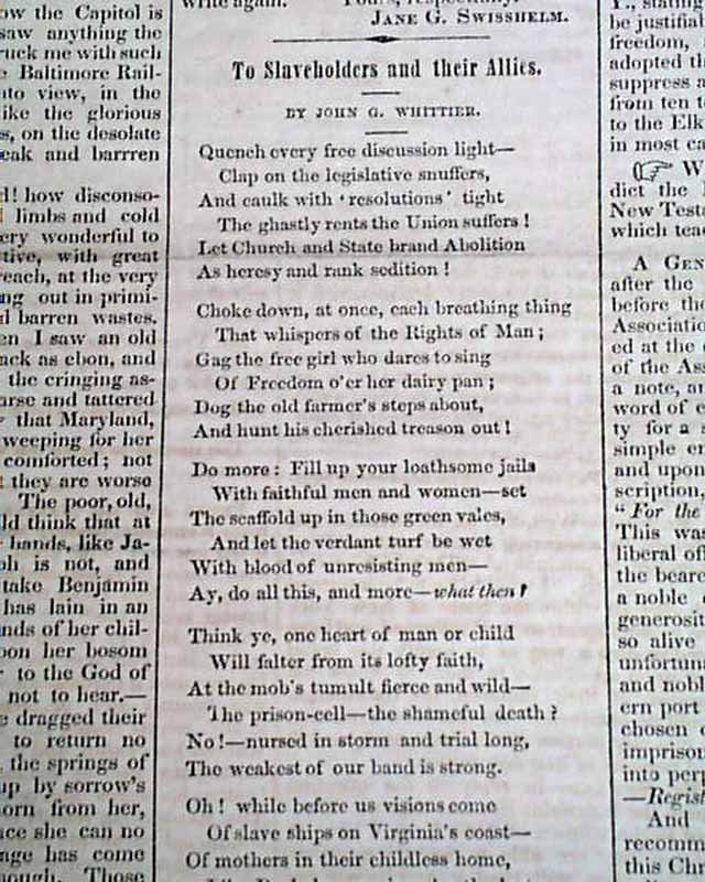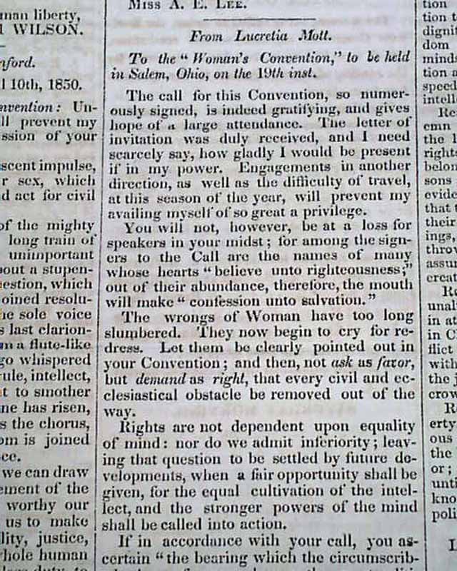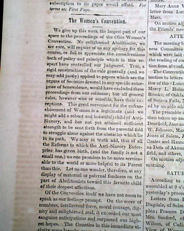 This issue has a wealth of fine, anti-slavery-themed articles including a poem: "To Slaveholders & Their Allies" by John. G. Whittier; "Taking Slaves to California" "The Women's Convention"; a letter signed in type by: Lucretia Mott & another from: Lucy Stone, & then a third letter: "From Elizabeth Cady Stanton", three pillars of the early women's rights movement.