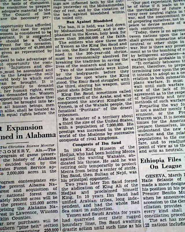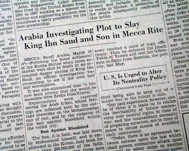 AI notes: In March 1935, there was an assassination attempt on King Abdulaziz Ibn Saud, the founder of modern Saudi Arabia, during his reign over the recently unified kingdom. The incident occurred in Mecca, when a man armed with a dagger tried to attack the King as he was entering the Grand Mosque. The would-be assassin, reportedly of Yemeni origin, was quickly subdued by the King’s guards before he could inflict harm. The motive was believed to be political, possibly linked to regional opposition or lingering tribal resentments following Ibn Saud’s consolidation of power across the Arabian Peninsula. The swift handling of the attack underscored both the King’s personal authority and the fragile stability of the new Saudi state during its formative years.