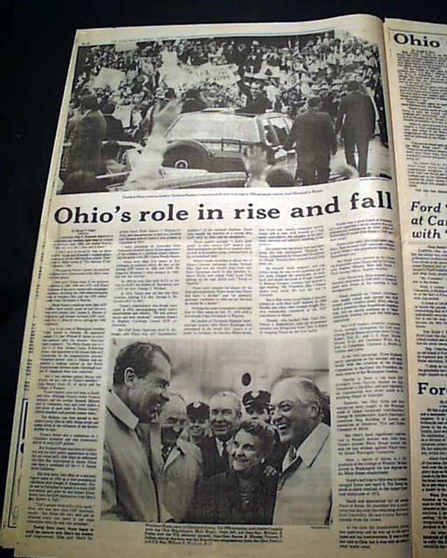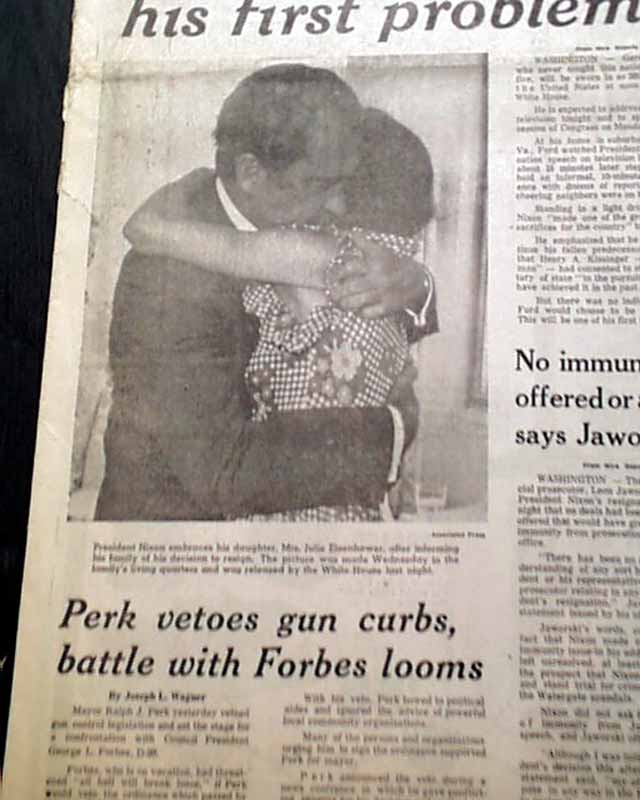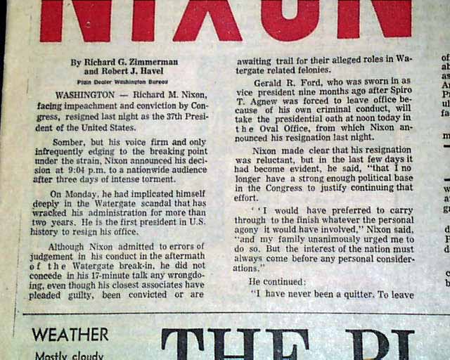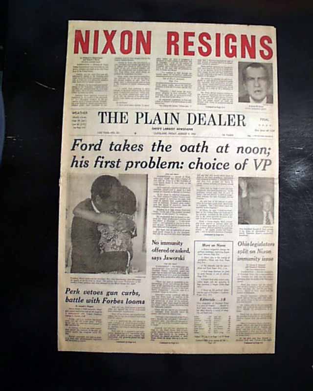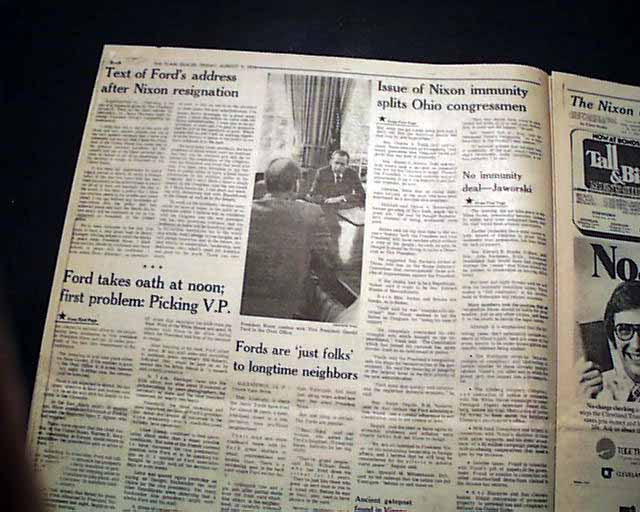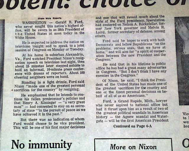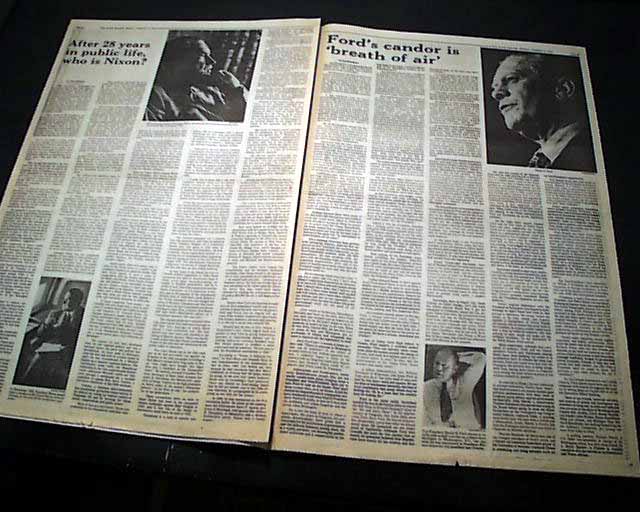 The front page has a nice banner headline above the masthead in red lettering: "NIXON RESIGNS" with "Ford takes the oath at noon; his first problem: choice of VP" and photos. (see) Nice for display. More inside.