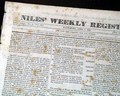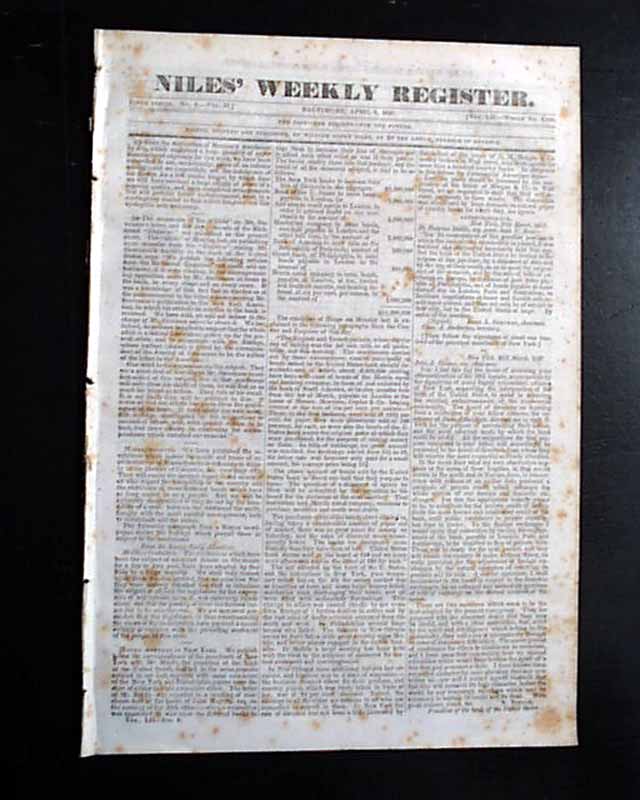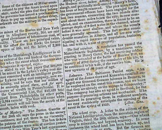 NILES' WEEKLY REGISTER, Baltimore, April 8, 1837 Page 5 has a bit: "California" concerning it declaring itself independent from Mexico, noting: "...the first article of the plan of the revolution at Monterey is that they declare themselves independent of Mexico until the re-establishment of the constitution of 1824...And, in conjunction with the Texas affair, will make the Mexicans very angry...". The bkpg. has an interesting bit: "The Last Survivor" concerning granting a pension to the $200 a year for life for: "...Henry Gates, the last surviving soldier who was wounded at the battle of Bunker Hill...He is now upwards of 80 years of age."