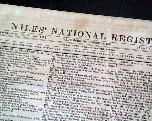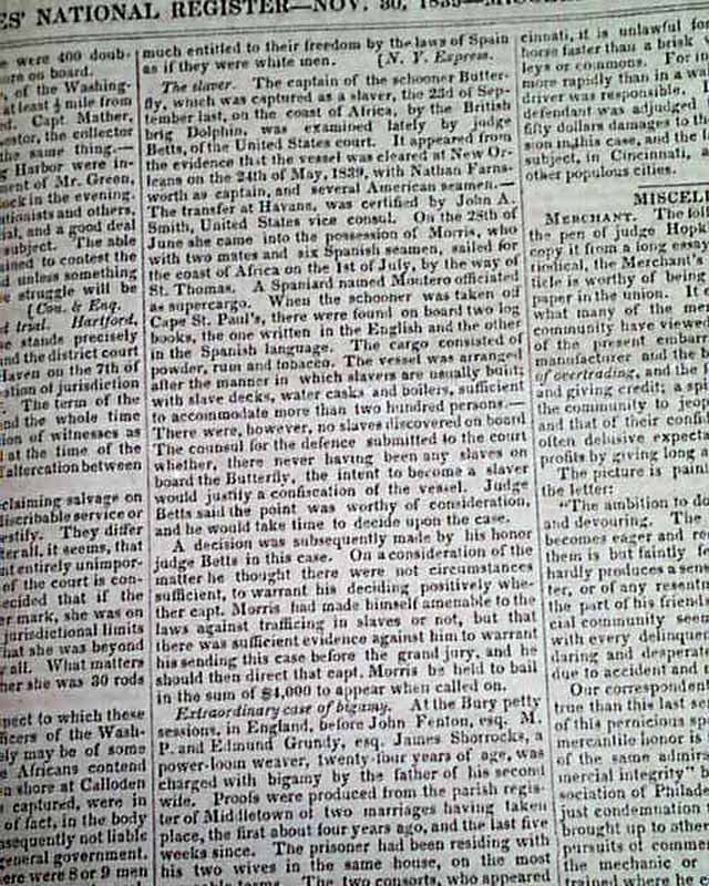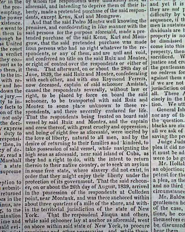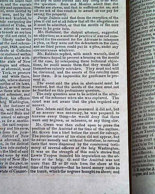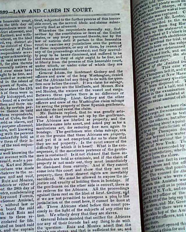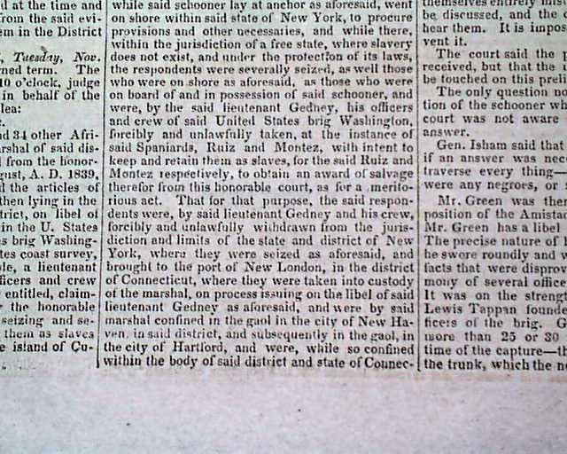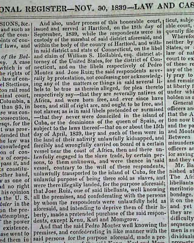 NILES' NATIONAL REGISTER, Baltimore, Nov. 30, 1839  Inside has a full page of very detailed coverage of the trial headed: "Slaves Per Amistad" at Hartford. A great wealth of detail. This famous slave ship and the revolt of its occupants was not only a notable legal case at the time, but in 1997 was made into feature length movie by Stephen Spielberg.