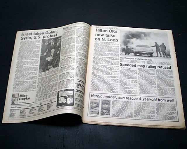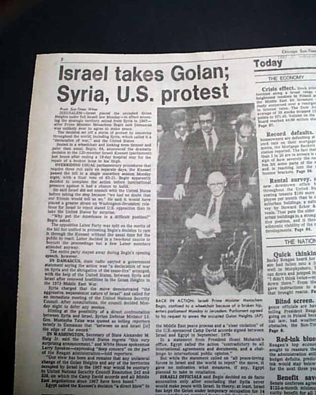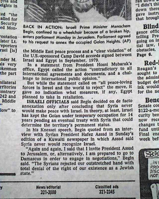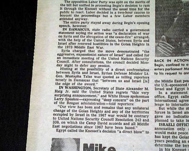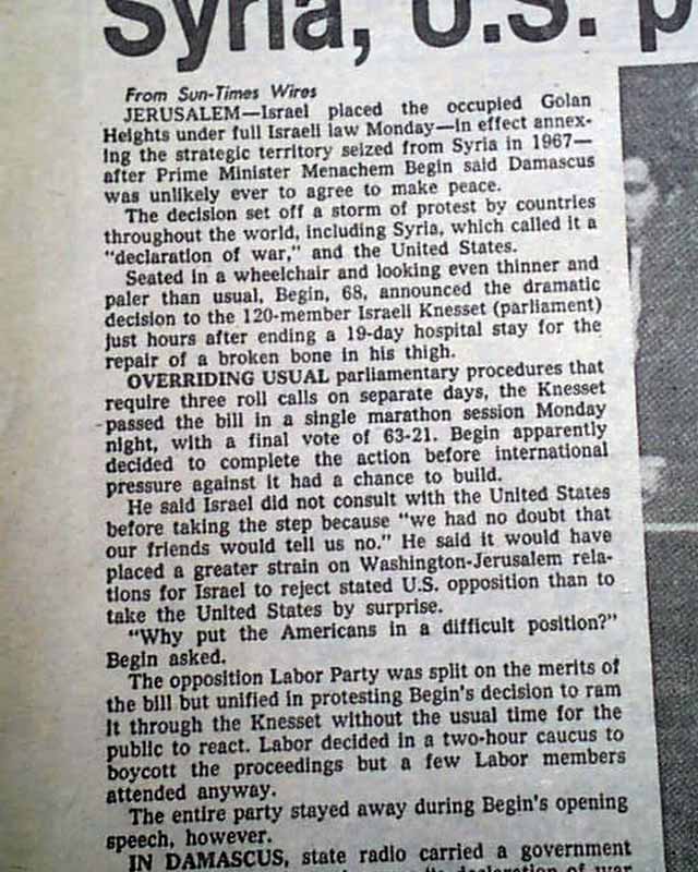 The front page has a banner heading: "Israel annexes Golan Hts." with lead-in: "'Declaration of war': Syria" Coverage is on page 2 with related photo. (see images)