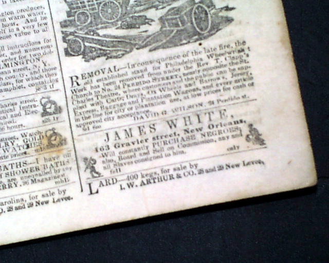 The bottom of the front page has a small ad for: "James White...Will constantly PURCHASE NEGROES; also Board and Sell on Commission, any and all Slaves consigned to him." which includes 2 small prints of slaves. Also two other slave-related ads on the front page.