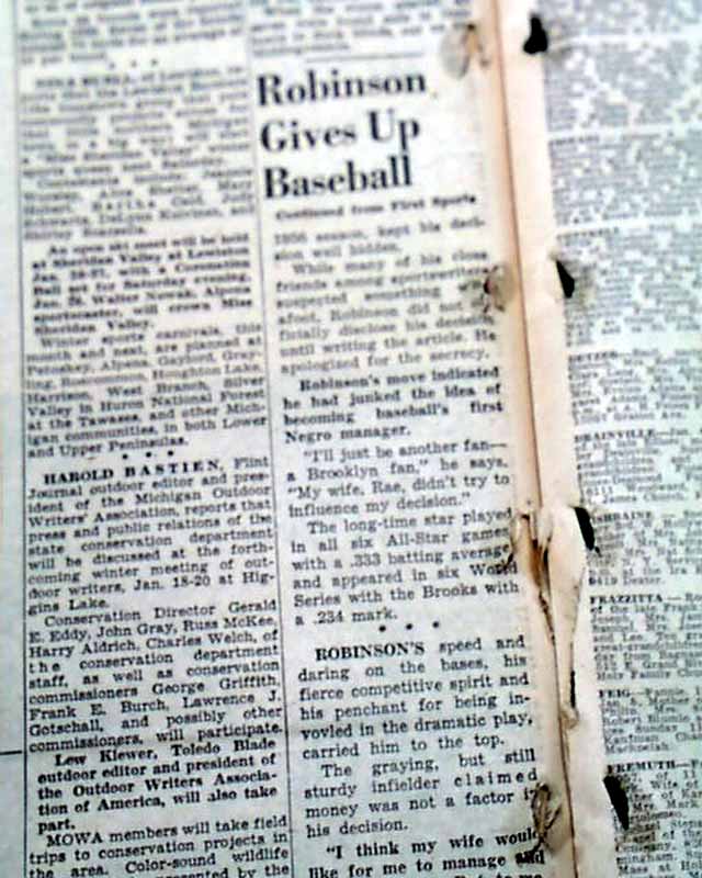 AI notes: In January 1957, Jackie Robinson, the trailblazing baseball player who broke Major League Baseball’s color barrier in 1947, officially announced his retirement from professional baseball. After a ten-year career with the Brooklyn Dodgers, Robinson had established himself as one of the greatest players in the game, earning six consecutive All-Star selections, the 1949 National League Most Valuable Player award, and helping lead the Dodgers to the 1955 World Series championship. His retirement marked the end of an era not only in sports but also in American social history, as Robinson had become a prominent figure in the civil rights movement, using his fame to advocate for racial equality and justice both on and off the field. Following his retirement, Robinson pursued a career in business and continued his activism, solidifying his legacy as a pioneering athlete and social leader.