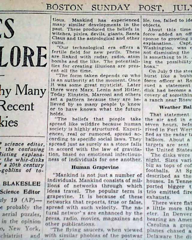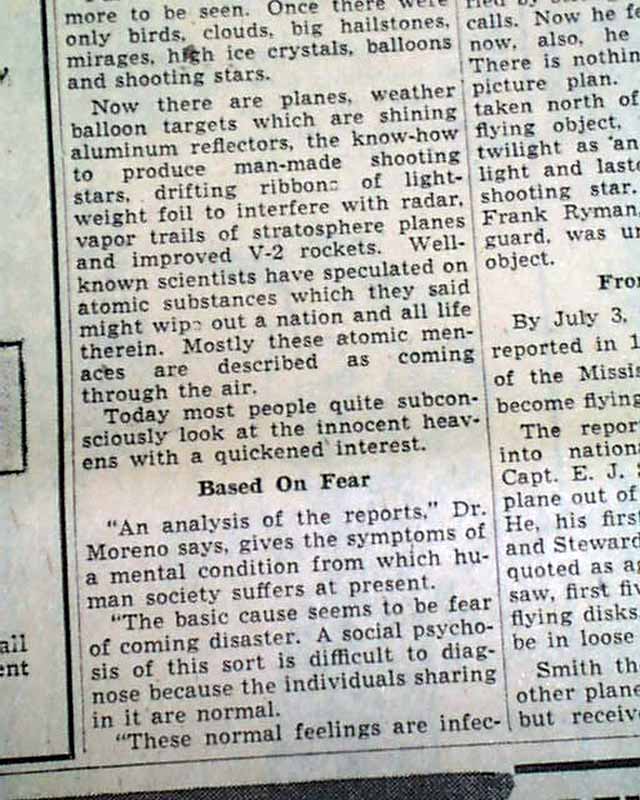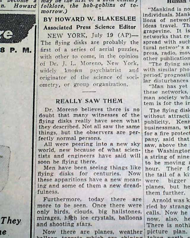 AI notes: In 1947, the American media and scientific community were grappling with the sudden surge of reports of “flying saucers,” sparked by Kenneth Arnold’s June sighting. Howard W. Blakeslee, the Associated Press science editor, approached the phenomenon with cautious skepticism, suggesting that many reports could be explained by reflections from distant aircraft or atmospheric optical effects, noting that clear air and sunlight could produce flashes that appeared disc-shaped from great distances. While he acknowledged that some observers, including Arnold, had genuinely seen something unusual, he emphasized that much of the hysteria stemmed from postwar anxieties about atomic energy and rocketry. Around the same period, Dr. J. L. Moreno, a Romanian-born psychiatrist and the founder of psychodrama and sociometry, was pioneering a radically different approach to human behavior, focusing on spontaneity, role-playing, and group dynamics in psychotherapy. Though Moreno’s work was entirely separate from the flying saucer craze, both he and Blakeslee were, in different ways, responding to the uncertainties of the era—Blakeslee in the scientific realm, seeking rational explanations for strange phenomena, and Moreno in the social-psychological realm, exploring how human perception, roles, and interaction shaped experience and understanding.