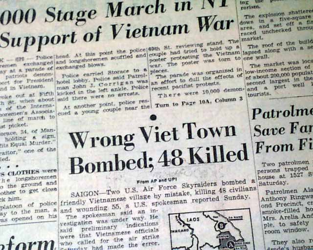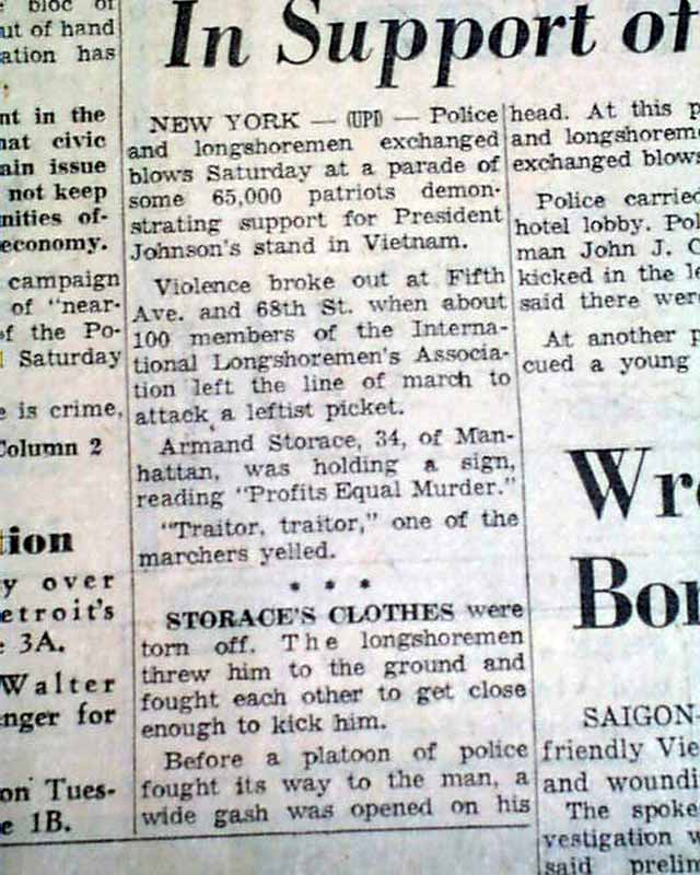 During the Vietnam War, much had been reported on the protests against U.S. action there. Here is a report of American citizens in support of our efforts over there. The front page has a three column heading: "65,000 Stage March in NY In Support of Vietnam War" with related photo. (see images)