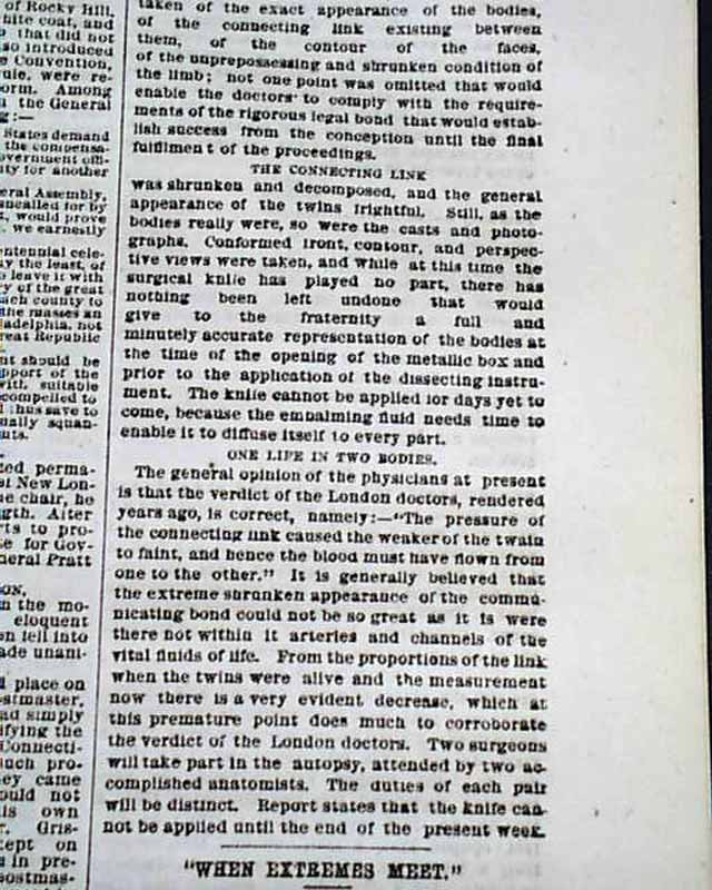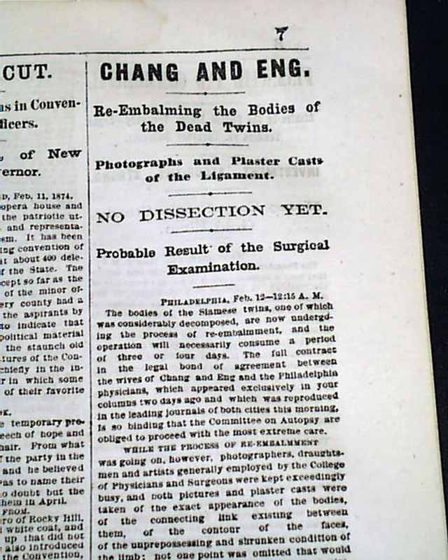 AI notes: After their deaths on January 17, 1874, the conjoined Siamese twins Chang and Eng Bunker were prepared for scientific examination and preservation. Their bodies, initially interred in Mount Airy, North Carolina, were exhumed on February 1, 1874, approximately fifteen days later, and injected with zinc chloride as part of the embalming process to prevent decomposition. Over the next several days, physicians from the College of Physicians of Philadelphia conducted a detailed autopsy, documenting the unique anatomy of the twins, including the shared liver and connecting tissues at the chest. While some sources note autopsy activity continuing through February 10–11, 1874, later references to February 12 likely relate to subsequent embalming or preparation for transport and display, though no primary source explicitly identifies it as a distinct re-embalming event. These procedures allowed the twins’ remains to be preserved for scientific study and contributed significantly to medical understanding of conjoined anatomy in the 19th century.