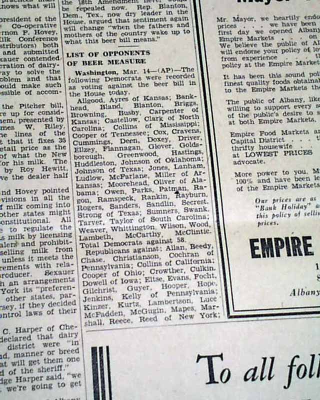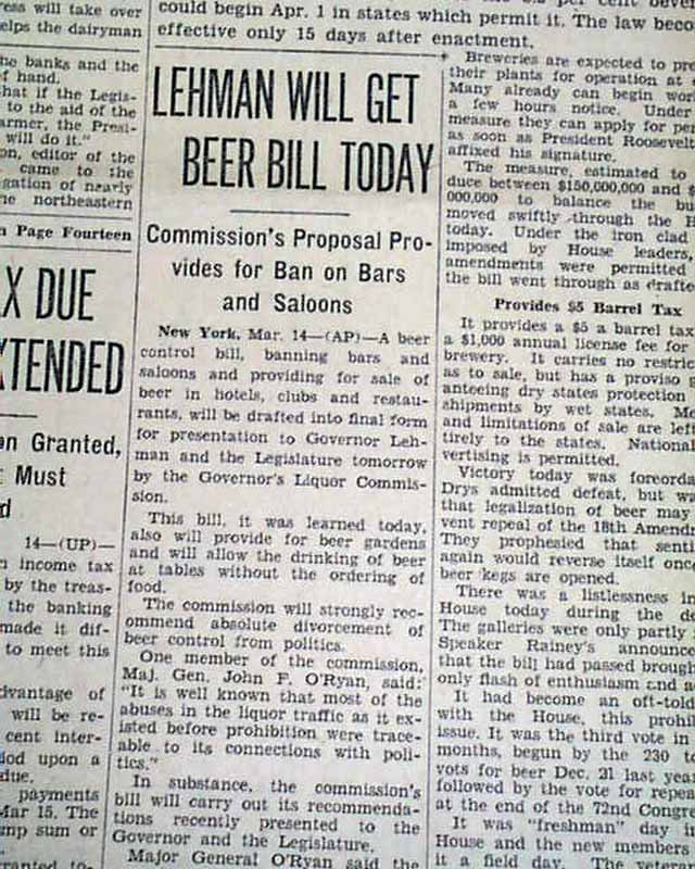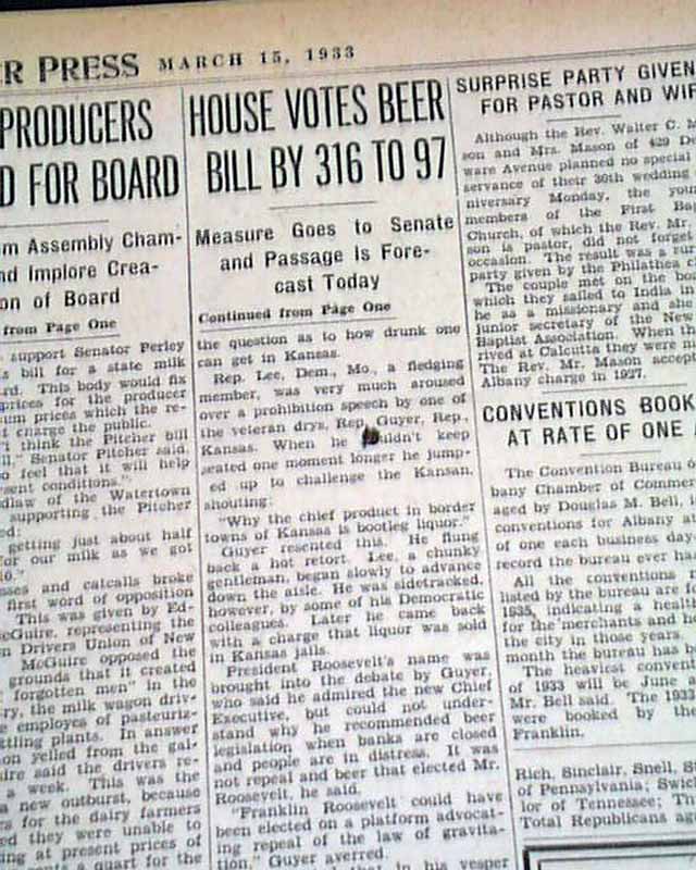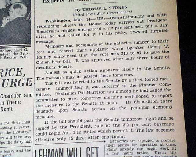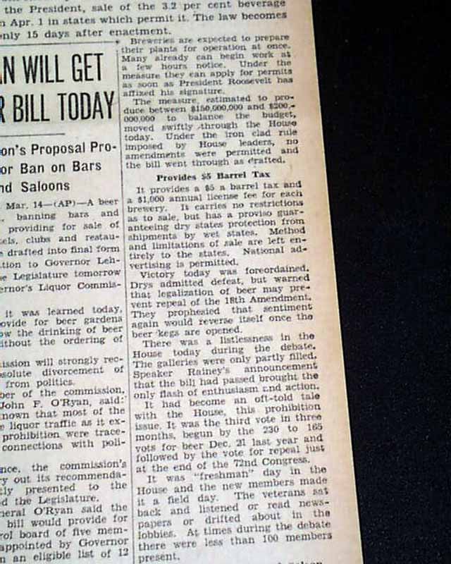 The top of the front page has a two column heading: "House Votes Beer By 316-97; Senate Action Due Today" with subheads. (see images) This led the way for president Roosevelt enacting the beer bill 9 days later which legalized the sale of beer and wine.