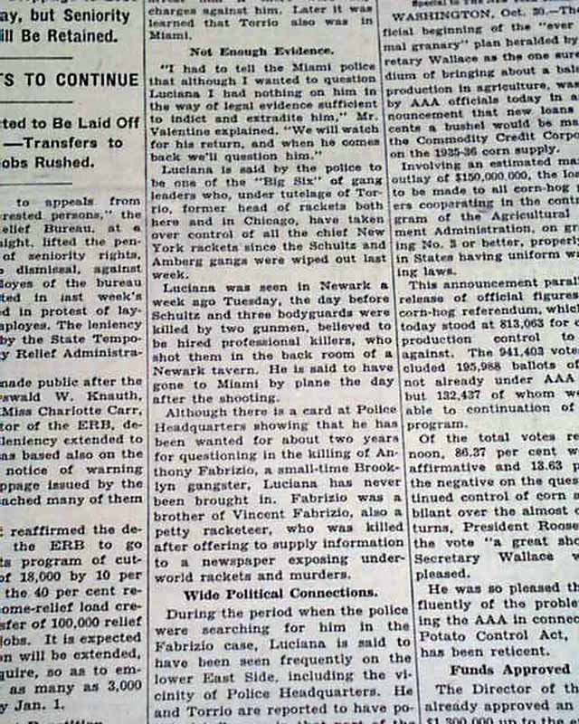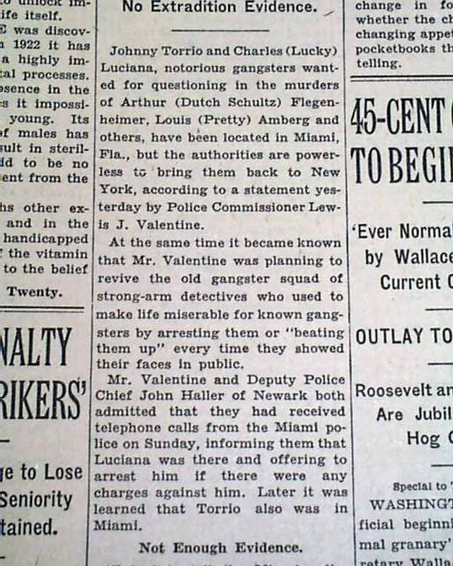 The top of the front page has one column headings: "POLICE TO REVIVE GANGSTER SQUAD; TORRIO IS IN MIAMI" "Valentine to Restore System of Picking Up All Outlaws Who Appear in Public" "Luciana Also In South" and more (see images).